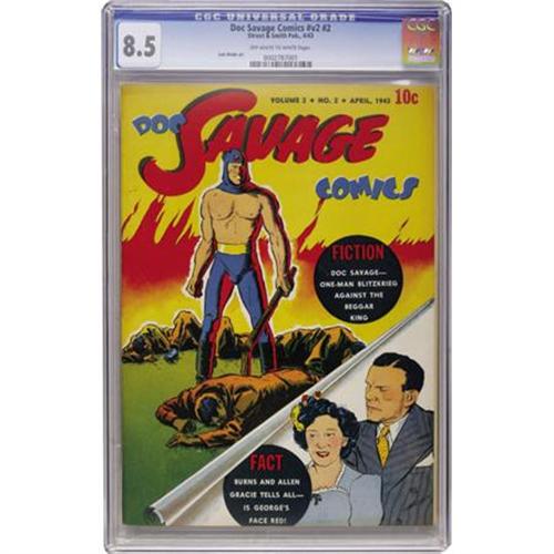 <B>Doc Savage Comics V2#2 (Street & Smith, 1943) CGC VF+ 8.5 Off-white to white pages.</B></I> Jack Binder art. Overstreet 2007 VF 8.0 value = $317; VF/NM 9.0 value = $509. CGC census 6/07: 1 in 8.5, 3 higher.<BR><BR><b>Shipping:</b> Comics - Slabbed (certified) (<a target="_blank" href="http://www.heritageauctions.com/common/shipping.php">view shipping information</a>)