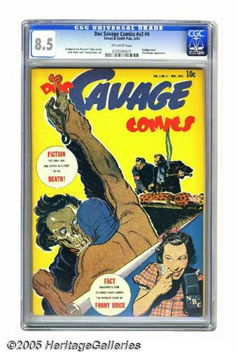 <B>Doc Savage Comics V2#4 (Street & Smith, 1943) CGC VF+ 8.5 Off-white pages.</B></I> A bondage and torture cover is the attention-getter here, but there's also lighthearted fare with a feature on Fanny Brice. The issue's artists include Jack Binder. Overstreet 2005 VF 8.0 value = $317; VF/NM 9.0 value = $484. CGC census 5/05: 1 in 8.5, none higher.
