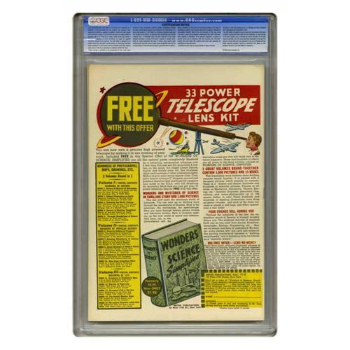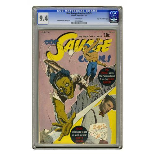 <B>Doc Savage Comics V2#5 Mile High pedigree (Street & Smith, 1943) CGC NM 9.4 White pages.</B></I> In addition to the lead story starring the Man of Bronze, there's a feature on Duffy's Tavern (from the radio show of the same name) and its grumpy manager Archie. CGC credits Alex Schomburg with the cover art... frankly, whoever made that attribution must have knocked back a few too many brewskies at Duffy's, but the point is, this is a gorgeous copy from the most famous pedigree of all, and it's the highest-graded copy of the issue that CGC has certified to date. Overstreet 2005 NM- 9.2 value = $650. CGC census 12/05: 1 in 9.4, none higher.