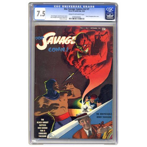 <B>Doc Savage Comics V2#7 (Street & Smith, 1943) CGC VF- 7.5 Cream to off-white pages.</B></I> Charles Coll cover. Backup feature on comedian Henny Youngman. Overstreet 2006 VF 8.0 value = $317. CGC census 3/06: 1 in 7.5, none higher.