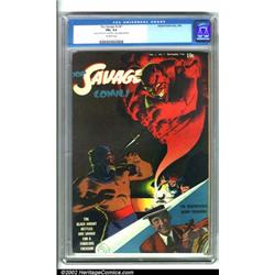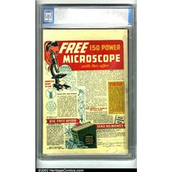 Doc Savage Comics vol. 2, #7 (Street & Smith, 1943). Based on Lester Dent's popular pulp-magazine hero, the comic book version of Doc Savage didn't have quite the longevity of his print predecessor, but enjoyed a healthy run nonetheless. The eclectic contents of this issue include not only a 16-page Doc adventure, but stories featuring Huckleberry Finn, Astron the Crocodile Queen, K-9-V, and Nick Carter. There's even a 6-page biography of comedian Henny Youngman, who is pictured on the cover. This beautiful copy has some edge wear, and a grease pencil mark on the back cover, but still has exceptional color and a remarkable lack of spine stress. The vivid cover image of a devil-like creature hurling a knife at Doc is quite striking. CGC notes, "tape removed from centerfold, and two center wraps are detached." CGC FN+ 6.5 Off-white pages. Overstreet 2001 FN 6.0 value = $153. Important notice: We expect to be auctioning lots at the rate of 200-250 per hour. Sometimes eBay Premier live bid software cannot keep up with that pace, so we strongly recommend that you place a realistic proxy bid now as insurance to avoid disappointment. Also please note that all Heritage/CAA lots purchased through eBay Premier carry a 20% Buyer's Premium.