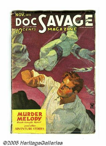 <B>Doc Savage Nov 1935 (V6#3) (Street & Smith, 1935) Condition: FN-.</B></I> Cover art by Walter Baumhofer. Includes the tale "Murder Melody" by Laurence Donovan. Full, unfaded spine. Untrimmed cover overhang. White pages. There is a one inch tear to the cover at the bottom of the spine. The Ultimate Guide to the Pulps VG value = $100.