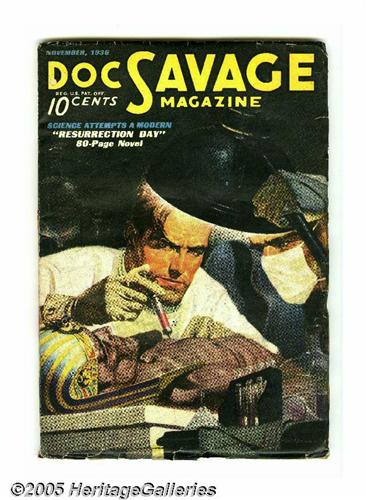 <B>Doc Savage Nov 1936 (V8#3) (Street & Smith, 1936) Condition: VG+.</B></I> Weird cover art by Robert Harris, showing Doc Savage as he gives an injection to an ancient Egyptian. Features the story "Resurrection Day" by Lester Dent. Full, unfaded spine, and untrimmed cover overhang. The front cover has a small hole punch at the top left corner, and there is a minor water stain at the top corner of the back cover; other than light general wear, there are no other defects to note. Covers are off-white; pages are cream. The Ultimate Guide to the Pulps VG value = $75.