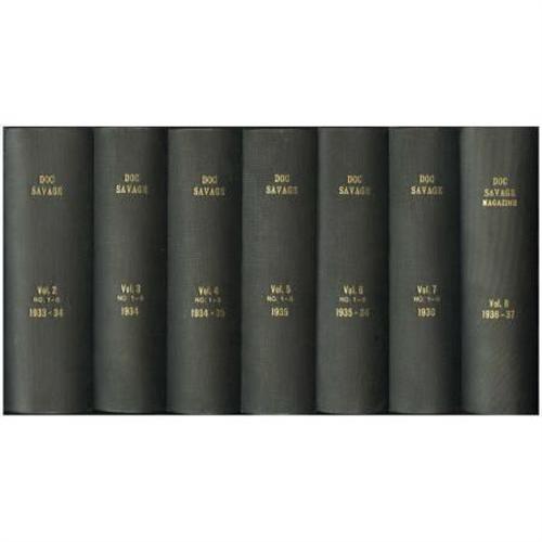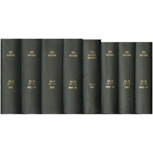 <B>Doc Savage V2#1 - V22#4 Bound Volumes Group (Street & Smith, 1933-43).</B></I> Every issue from September 1933 to December 1943 (the last issue before the series converted to digest size) is included in this group of 21 bound volumes. All books are black hardcovers with gold lettering on the spines. All issues have been trimmed in the binding process as usual. While the first six volumes have fairly heavy cover creasing, and inside front covers reinforced with tape, the covers of the remaining issues look fantastic with no reinforcement. The pages are cream to off-white (cream on the first few volumes). Volumes 7, 8, 11, and 13 have large water stains at the top outside corner. With a solid ten years' worth of stories, this group will have any Doc fan making a "low trilling sound!" Approximate Bookery's Guide to Pulps VG value for group = $8,000.<BR><BR><b>Shipping:</b> Comics Box - Full, Short (<a target="_blank" href="http://www.heritageauctions.com/common/shipping.php">view shipping information</a>)