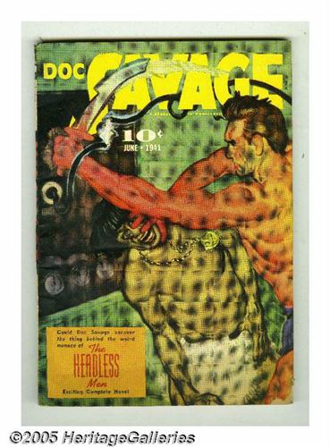 <B>Doc Savage V27#4 (Street and Smith, 1941) Condition: VG/FN.</B></I> Doc uncovers another "weird menace" in "The Headless Men." A beautiful copy that would grade even higher except for a lightly chewed bottom right corner. The Ultimate Guide to the Pulps VG value = $45.