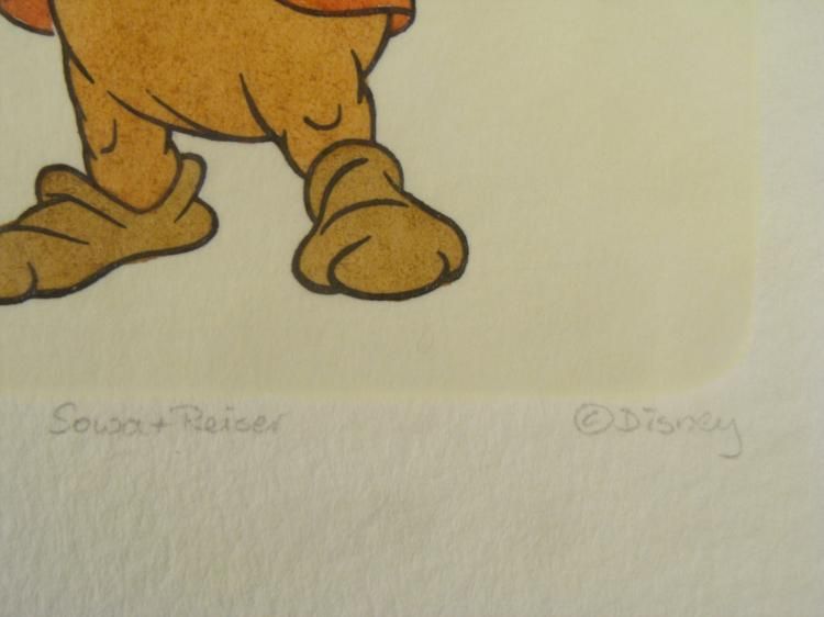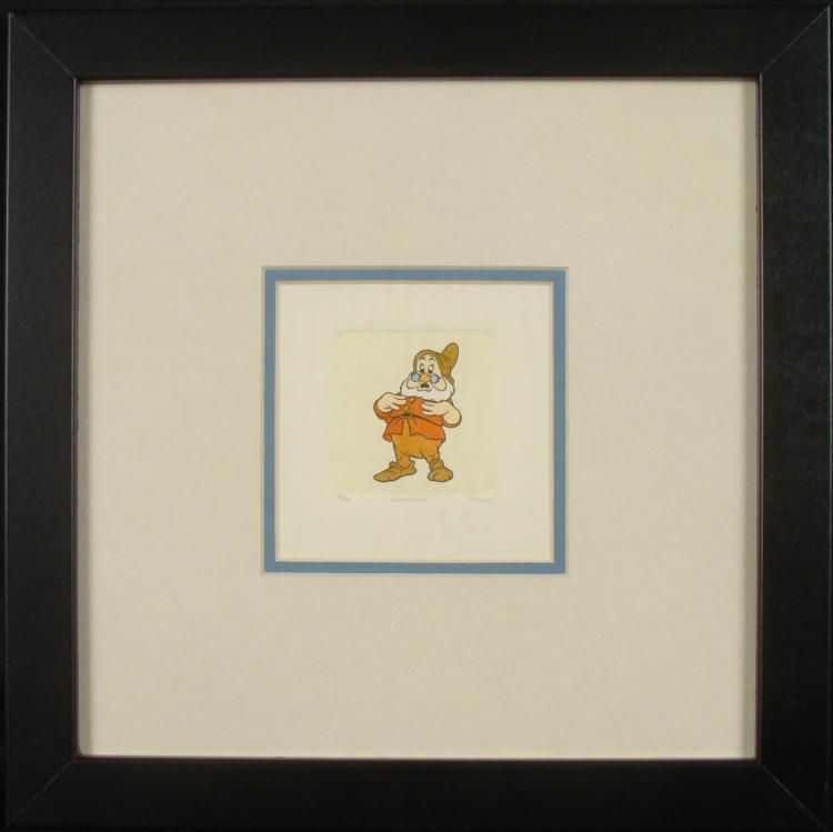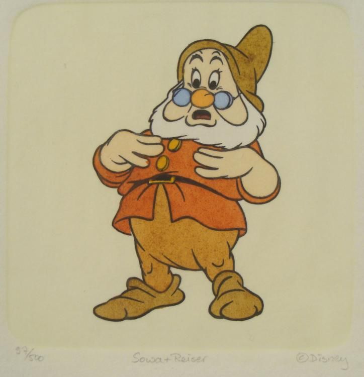 Here is Doc from Snow White & the Seven Dwarfs This original etching was produced by the studios of artists Sowa and Reiser under Disney license. The outline was hand etched into a copper plate, inked into hand-made paper, then hand-painted in watercolor. * Medium: Original etching on hand-made paper, colored in watercolor paintArtists: Sowa & ReiserSignature: In pencil, lower rightEdition: 37/500Image size: 2 3/4 inches squareFraming: Double matted in blue and white, in black wood frameFrame size: 14 inches squareCondition: Excellent