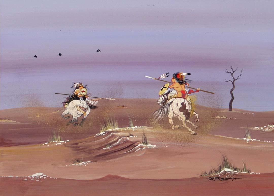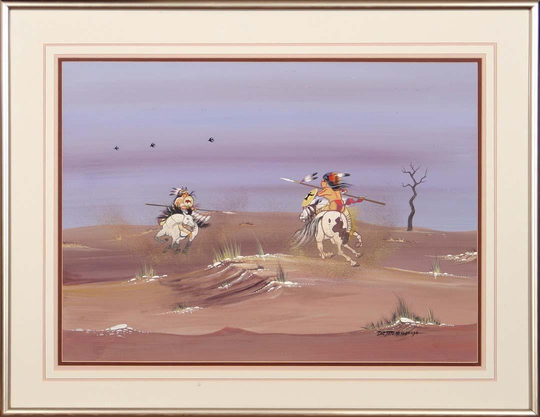 Doc Tate Nevaquaya (1932-1996). At Battle. 17" x 23 1/2" gouache. Signed lower right. (est $750-1,000). Provenance: Ex-La Junta, Colorado Estate. For condition reports please visit: www.auctioninsantafe.com/cr2011.pdf