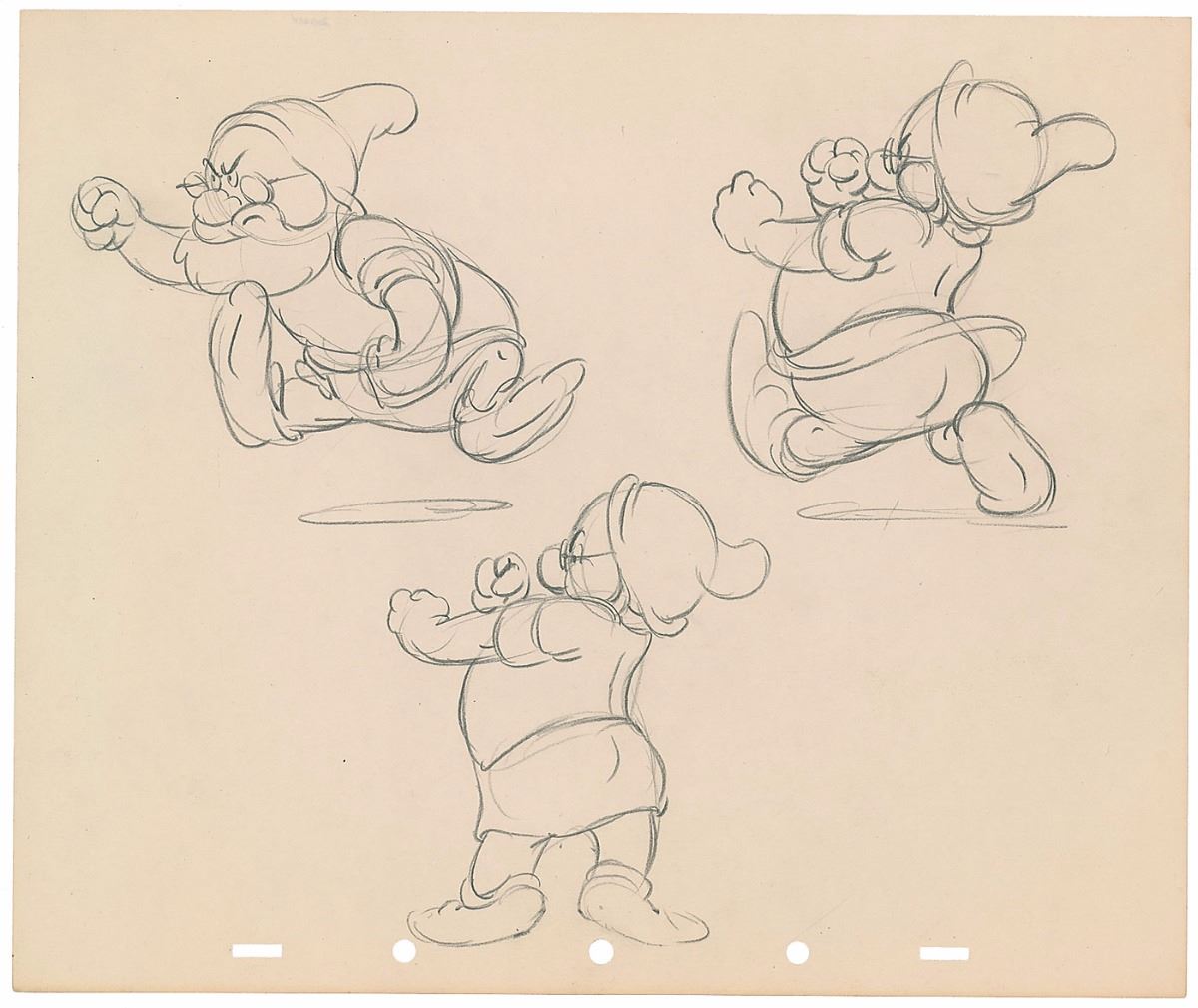 (Walt Disney Studios, 1937) Original preliminary model sheet drawing featuring Doc from Snow White and the Seven Dwarfs, showing him in three different fighting poses. Accomplished in graphite on untrimmed 12 x 10 animation paper. Each image measures about 4 x 4.5. In fine condition.