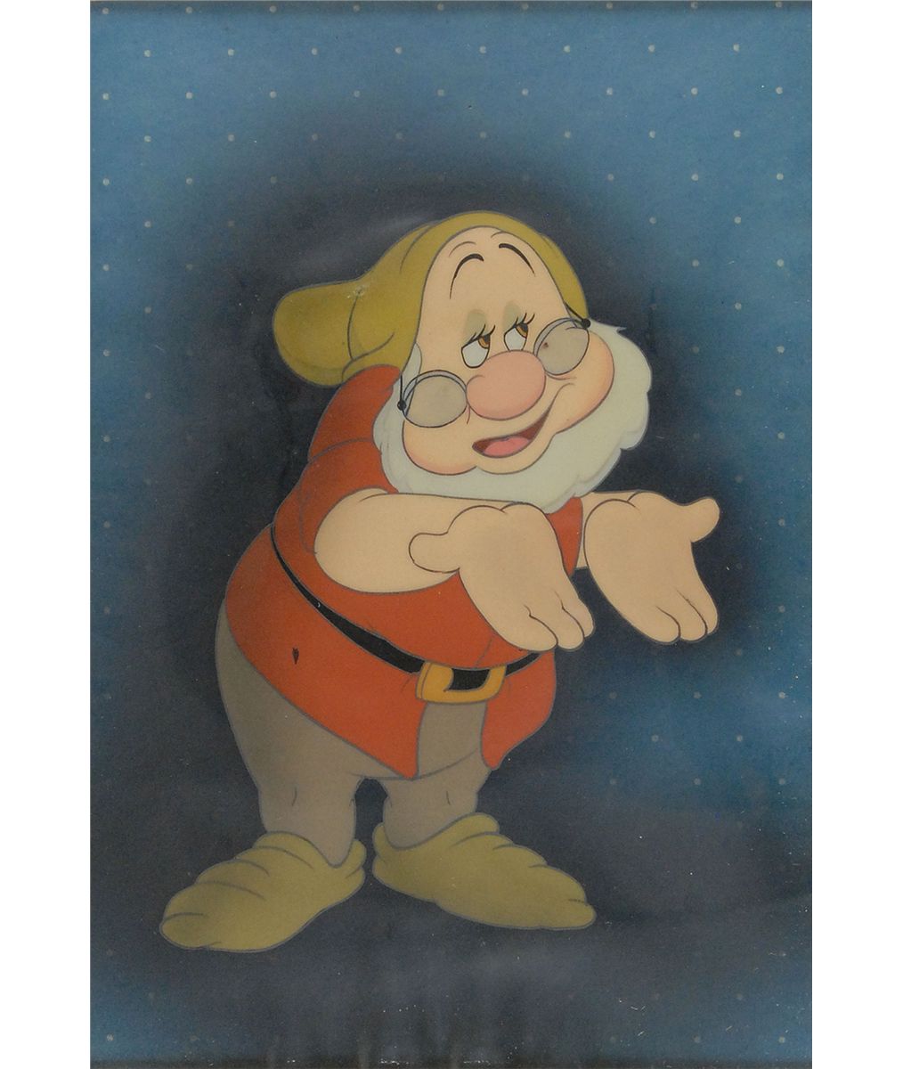 (Walt Disney Studios, 1937) Original production cel featuring Doc from Snow White and the Seven Dwarfs. The cel has been applied to an airbrushed background as prepared by Courvoisier Galleries for sale. Image of Doc gesturing with his palms up measures 3.5 x 5, with a mat opening of 4.5 x 7. This piece is also framed to an overall size of 10 x 13. In fine condition. A beautiful full-length image of the lovable leader of the dwarfs.