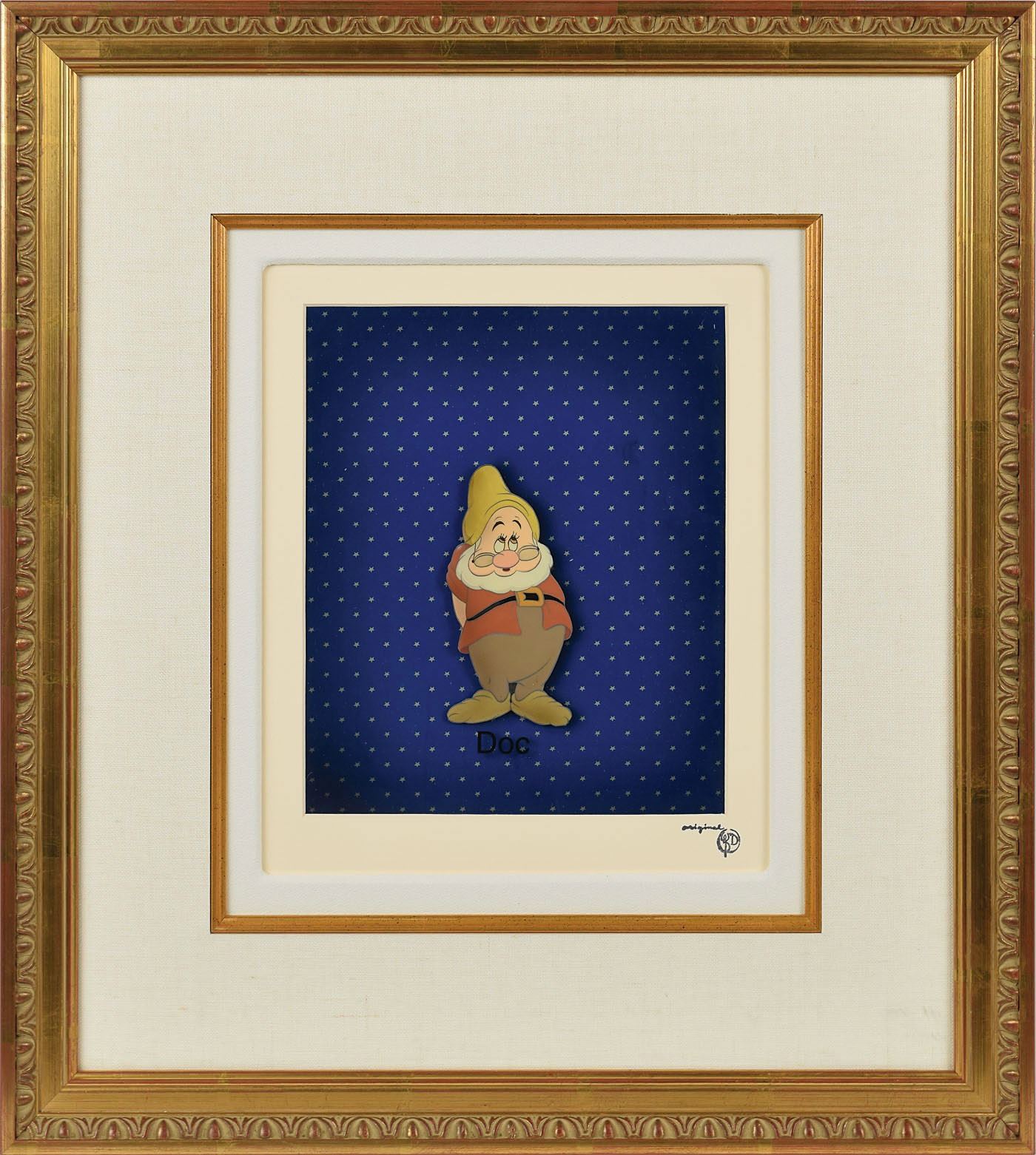 (Walt Disney Studios, 1937) Appealing original production cel featuring Doc from Snow White and the Seven Dwarfs, showing the leader of the dwarfs in a decidedly bashful full-length pose. The cel has been trimmed and applied to a star background as prepared by Courvoisier Galleries for sale. Character image measures 2 x 4.25, with a mat opening of 6.75 x 8.5. Archivally cloth-matted and framed to an overall size of 16.75 x 18.5. In fine condition.