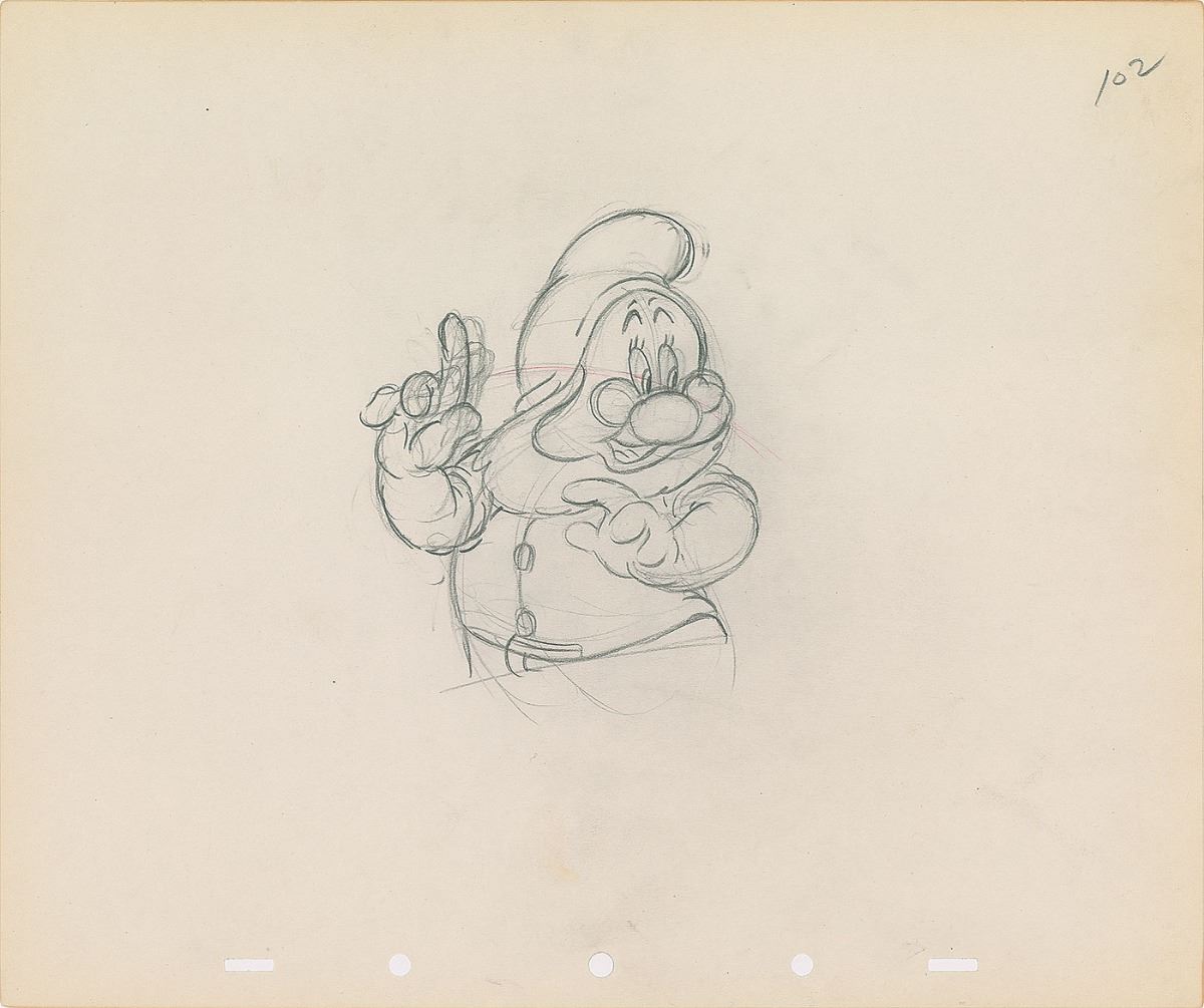 (Walt Disney Studios, 1937) Original production drawing featuring Doc from Snow White and the Seven Dwarfs, showing him with a finger raised. Accomplished in graphite on untrimmed 12 x 10 animation paper. Image measures 4 x 5. In fine condition.