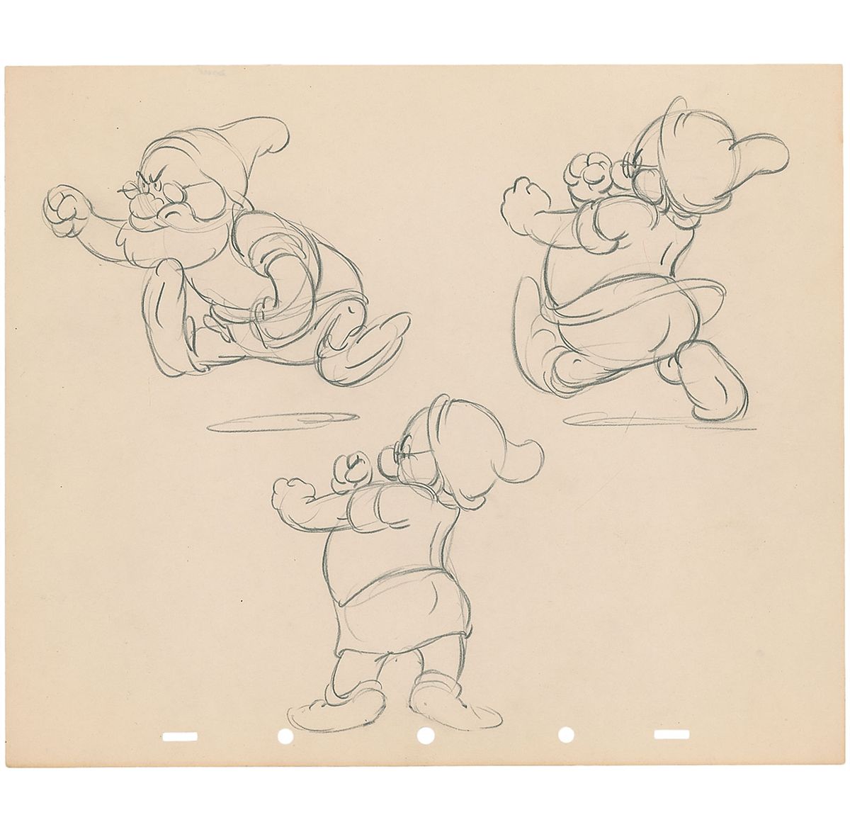 (Walt Disney Studios, 1937) Wonderful original production drawing featuring three poses of Doc the Dwarf from Snow White and the Seven Dwarfs. Accomplished in graphite on untrimmed 12 x 10 animation paper. Images measure 5.25 x 4.5, 4.25 x 4.75, and 4 x 4.75. In fine condition. An appealing preliminary model sheet of the dwarf leader.