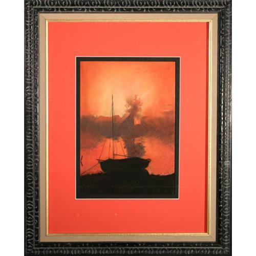 </font></strong>This original work by Rose Brown shows off her talent as an artist in this medium. Seen here is a small sailboat tied up to the shore with a brilliant sunset display of golds, yellows, oranges, and browns behind. The small boat is showcased before a wonderful display of the artist?s talent in their rendition of the sunset on the horizon. Shadows and reflections mark the artist?s strong command of their profession and the medium. This is truly a must have for anyone who appreciates a luminous sunset or has an affinity for sailing and water.