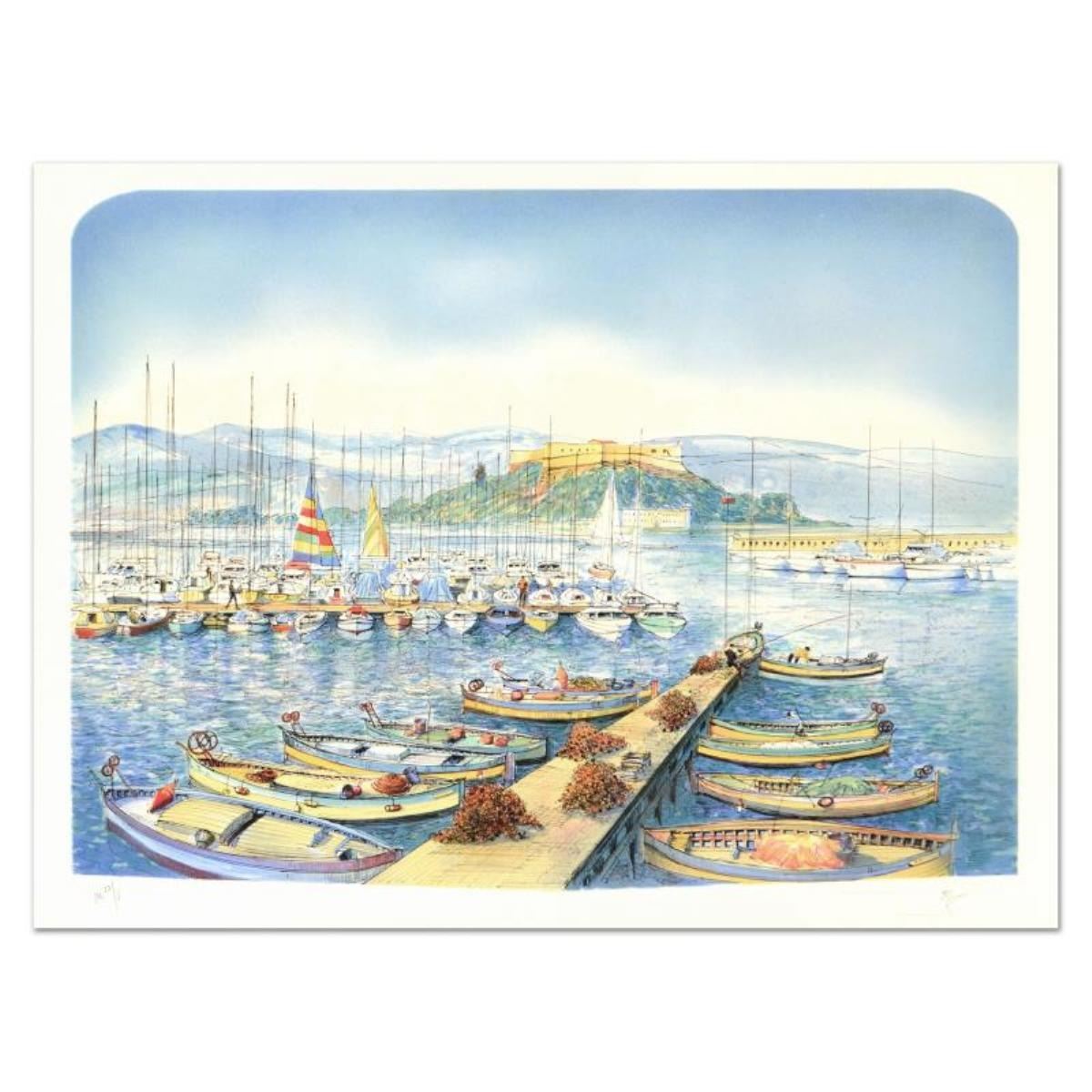 "Docks" is a limited edition lithograph on paper by Rolf Rafflewski, numbered and hand signed by the artist! Measures approx. 30" x 22" (border). 27" x 19" (image).