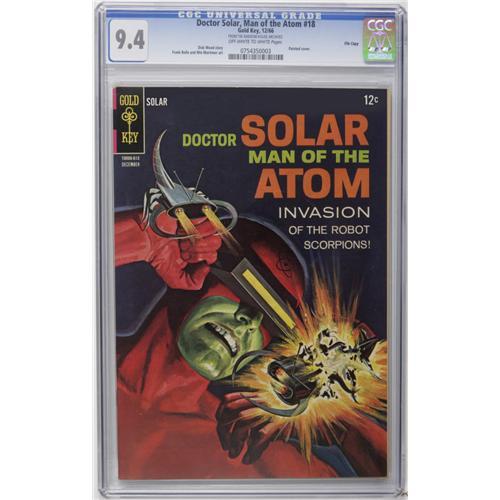 <B>Doctor Solar #18 File Copy (Gold Key, 1966) CGC NM 9.4 Off-white to white pages.</B></I> Painted cover. Frank Bolle and Win Mortimer art. Overstreet 2006 NM- 9.2 value = $45. CGC census 8/06: 8 in 9.4, 6 higher. <I>From the Random House Archives</B></I>.