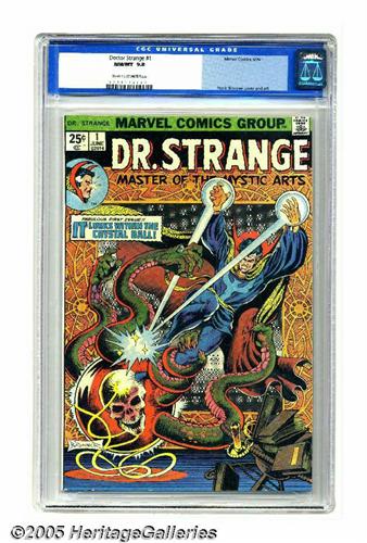 <B>Doctor Strange #1 (Marvel, 1974) CGC NM/MT 9.8 Off-white to white pages.</B></I> Some five years after the demise of his previous series, the Master of the Mystic Arts got another shot at his own title. Frank Brunner drew the cover and the story, and is even credited as co-plotter along with ace writer Steve Englehart. Overstreet 2005 NM- 9.2 value = $80. CGC census 6/05: 11 in 9.8, none higher.