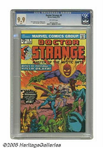 <B>Doctor Strange #8 (Marvel, 1975) CGC MT 9.9 Off-white pages.</B></I> Doctor Strange takes on the Dread Dormammu in this issue from the creative team of writer Steve Englehart and artist Gene Colan (who's expertly inked by Tom Palmer). Also, we, the readers, find out more details of Clea's origin. The cover is by Gil Kane. Overstreet 2005 NM- 9.2 value = $12. CGC census 1/05: 1 in 9.9, none higher. <I>From the collection of Chris Bell.</B></I>