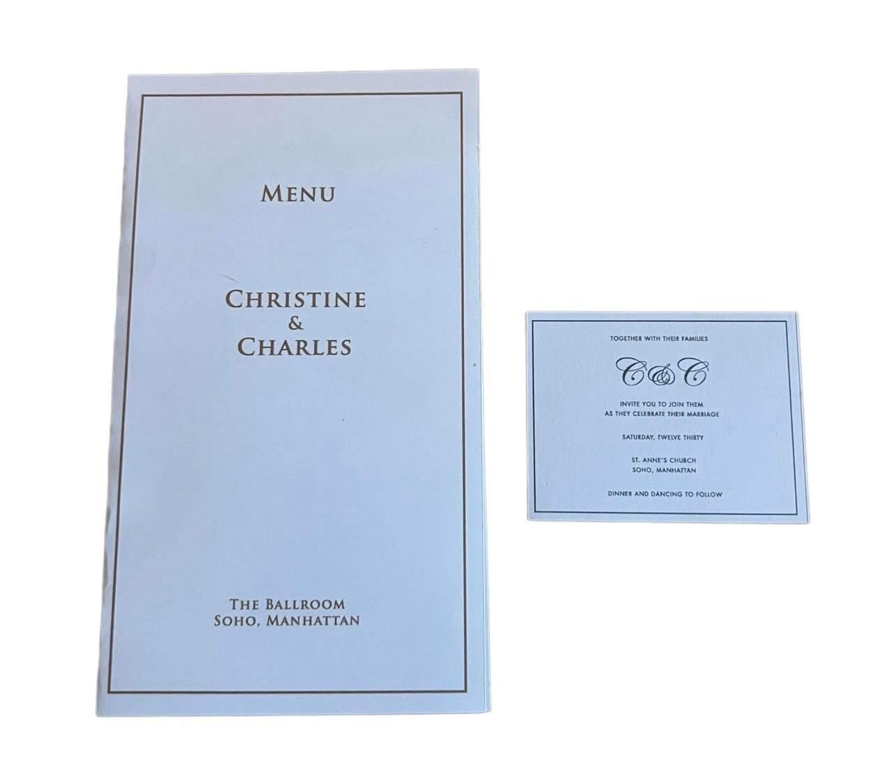 Original invitation and menu for Dr. Christine Palmer (Rachel McAdams) wedding from the production of the Sam Raimi directed superhero film 'Doctor Strange in the Multiverse of Madness' (2022), where Strange protects America Chavez (Gomez), a teenager capable of traveling the multiverse, from Wanda Maximoff (Olsen).