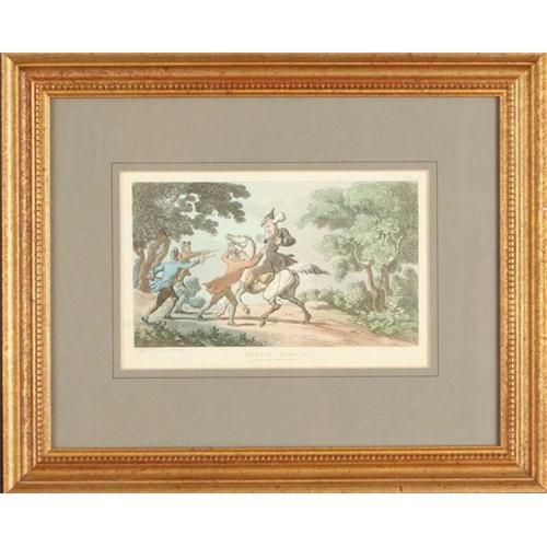 Stopped by The Highwayman is A doctor Syntax Print have been taken from the Third Tour of doctor Syntax in the 19th century they are coloured Aquatints named by Rowlandson the image is 7.5 " X 4.5" and is matted with a matching color matboard and framed with exotic Allegra frame golden rich looking that matches the interesting exciting print at the size of 14.5" X12"
