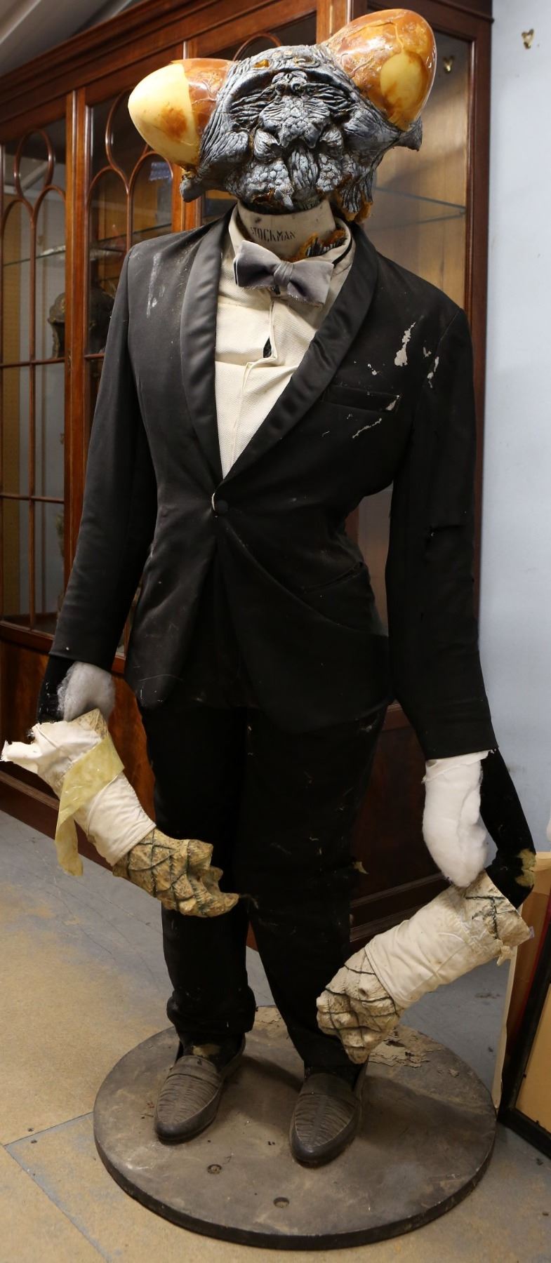 Doctor Who - Replica freestanding Husk costume from Ghost Light (1989). The head, in the form of a fly, and hands are made from moulded plastic and foam latex. The costume also comprises a tuxedo jacket with matching trousers, a white waffle shirt, a blue velvet bow tie, a pair of grey socks and a pair of slip on grey shoes, on mannequin and base. The head and hand pieces were pulled from the original screen used costume mould, and this piece was created by the effects workshop. Approximately 159cm high.Provenance: Bonhams: Entertainment and Memorabilia Auction 2010, Lot 137.