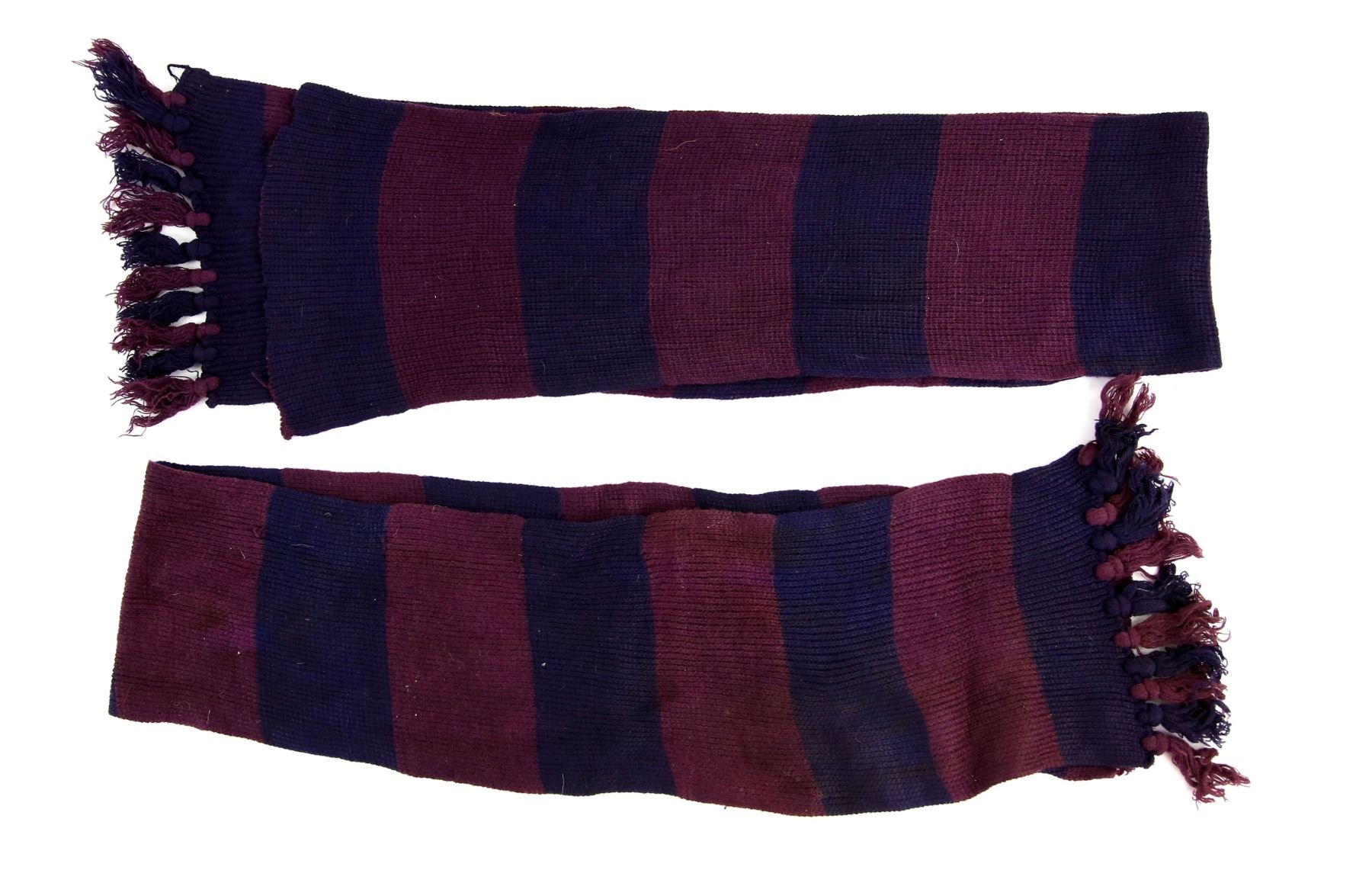 Doctor Who - Slyvester McCoy (7th Doctor) knitted blue and mauve regeneration scarf from Time and the Rani (1987).Provenance: Bonham's: Doctor Who The Auction, 24th February 2010, part lot 91. With auction label.