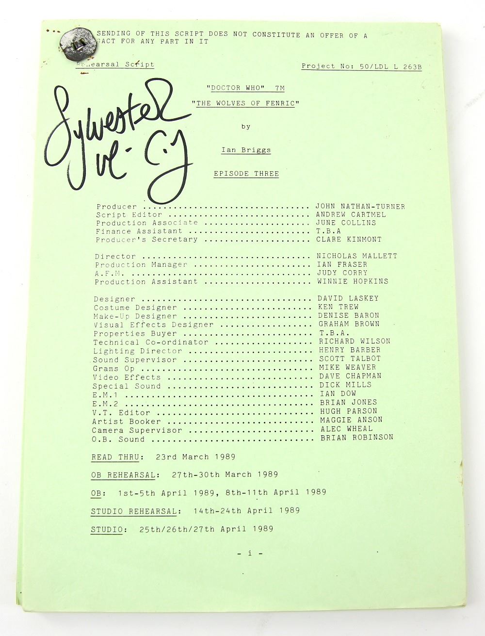 Doctor Who - The Wolves of Feneric by Ian Briggs Original Rehersal Script from 1989 signed to the fr