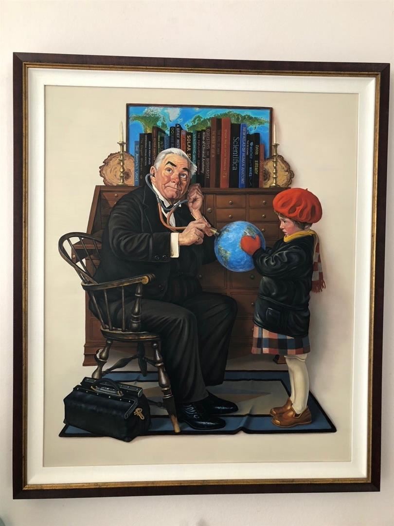 "Doctor and Earth" is a 36x30" framed ORIGINAL oil on canvas by Charles Lynn Bragg, using Norman Rockwell's charming image to remind us that our planet needs loving care, attention and regular checkups.