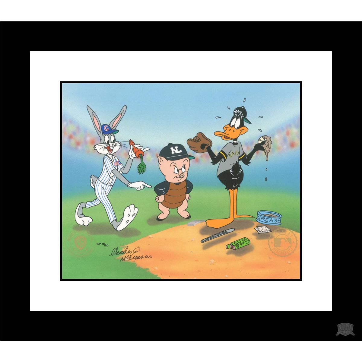 This beautifully framed 12-field hand-painted cel features Cubs player Bugs Bunny calling out Daffy Duck for doctoring the ball as Elmer the umpire looks on. "Doctoring Daffy" is limited to 250 pieces and is signed by animator Charles McKimson. COA incl