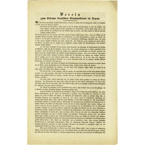 <B>[German Emigration to Texas]: </B></I><B><I>Prioritats-Obligation Des Vereins Zum Schutze Deutscher Einwanderer In Texas Uber 500 Gulden Im 24 1/2 Gulden Fuss....</B></I></B></I> Weisbaden. 1850. 4pp. Folding folio sheet, printed on 2 pages, 2 pages blank tables. An unissued bond for financing the German colonization effort in Texas, as part of a proposed float of 1,600,000 gulden. This bond was signed in manuscript by a representative of the Verein but is unnumbered and evidently was not issued.<BR><BR><b>Shipping:</b> Flat Material, Small (<a target="_blank" href="http://www.heritageauctions.com/common/shipping.php">view shipping information</a>)