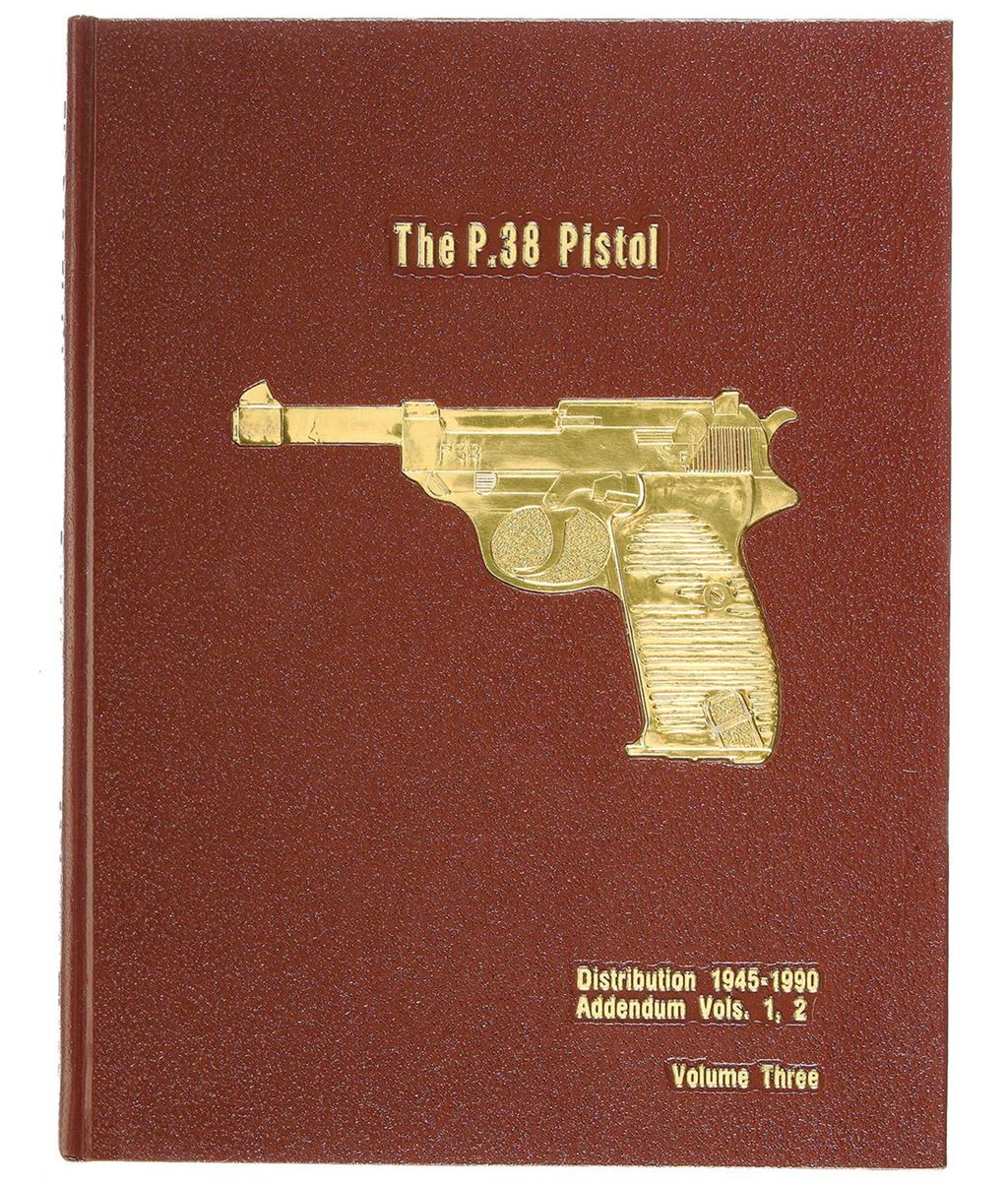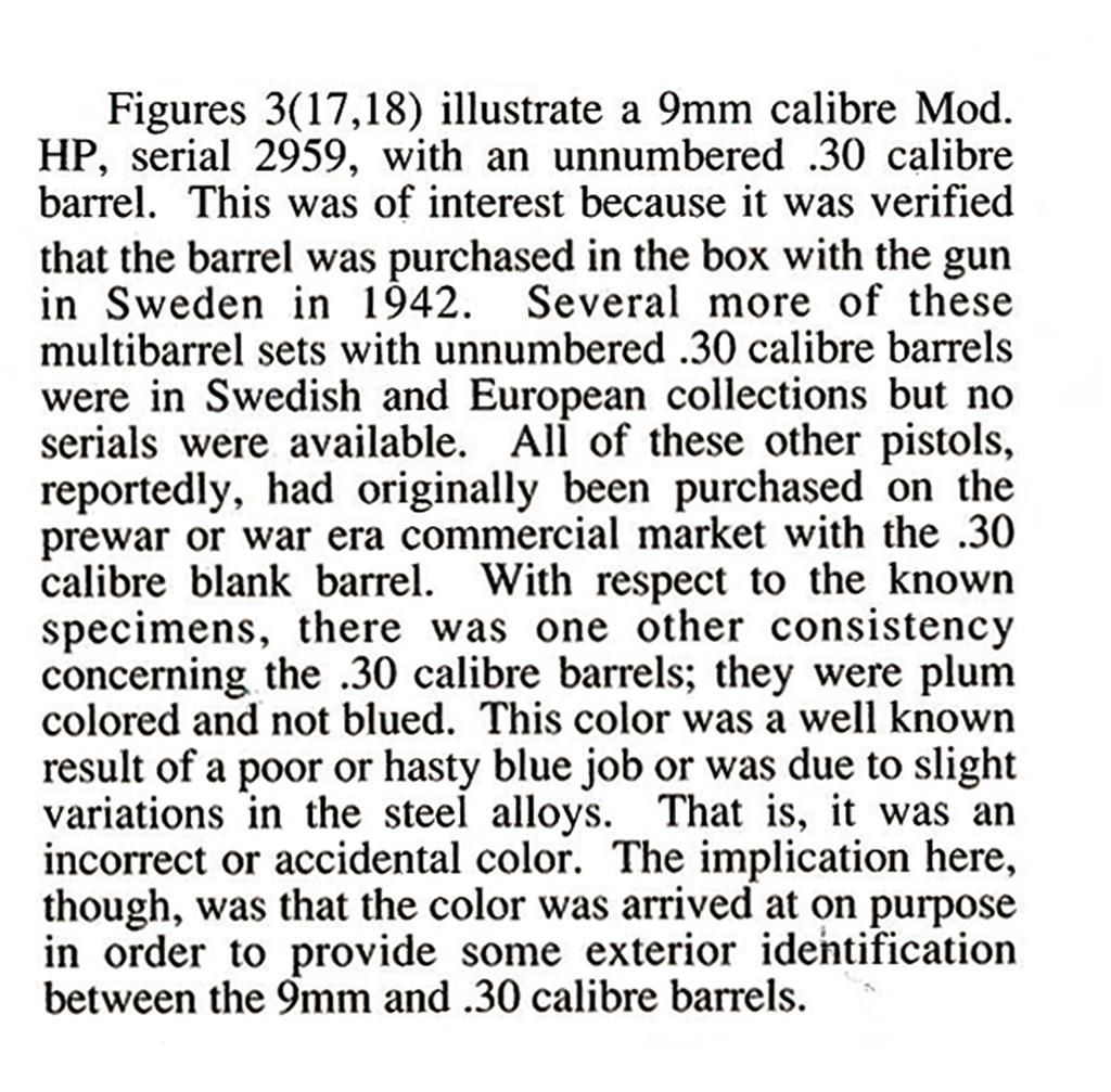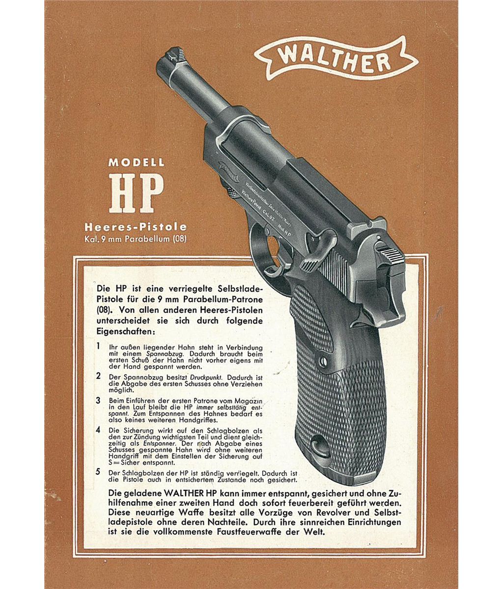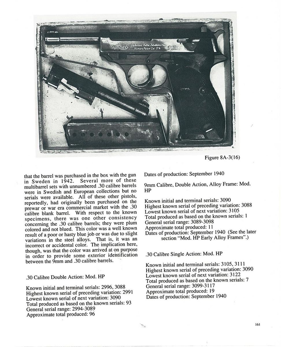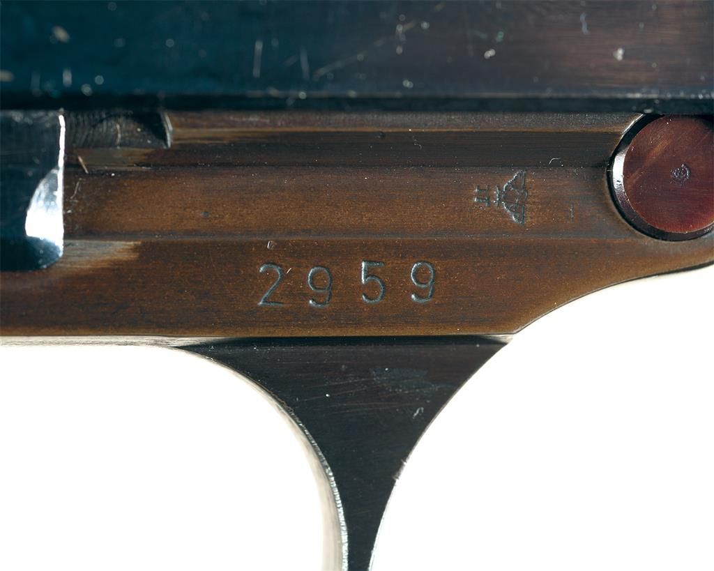 Shortly after Walther began the sale of the commercial model of their P.38 pistol known as their Model HP pistol, they produced a small number of guns in caliber 7,65 m/m (.30 caliber) Parabellum rather than the normal caliber of 9 m/m. Note that with a P.38 pistol, the barrel assembly can easily be switched to the different caliber barrel and no other modifications are needed to the mechanics of the pistol. The serial numbers of the 7,65 m/m Model HP pistols reportedly begins just below serial 3000. Prior to the production of these 7,65 m/m Model HP pistols, Walther manufactured and sold a very small number of 9 m/m caliber Model HP pistols with an extra barrel assembly in caliber 7,65 m/m. On all of these pistols, the slide is marked 9 m/m. Refer to pages 158-162 in Buxton's Volume 3 "The P.38 Pistol" for a discussion of these pistols with the extra barrel. Some of these pistols with the extra barrel had the extra barrel serial numbered to the pistol, but others did not have a serial number on the extra barrel. Pistol serial number 2951, shown on pages 160 and 161, has the extra barrel serial numbered. This pistol, serial 2959, has the extra barrel without a serial number, and this exact pistol is discussed starting at the bottom of pg 158-161 and is pictured on page 162. This pistol's serial number is also listed on page 252, along with a 7,65 m/m Luger auto barrel (no gun) serial numbered 2953. From these few surviving serial numbered pistols it can be concluded that the guns delivered with the extra barrel are all found in a small group of guns roughly around serial number 2950. Also, as noted on page 161, all of the extra 7,65 m/m barrels, whether serial numbered or not, are finished in a plum color to easily distinguish them from the blued 9 m/m barrel. Buxton notes on page 161 that "several more of these multi-barrel sets with unnumbered .30 caliber barrels were recorded in Swedish and European collections, but no serial numbers were available." This pistol is "Eagle N" proofed on the right side of the slide, frame, barrel assembly and barrel locking block. The serial number 2959 is on the front below the barrel, on the right side of the frame, on the rear underside of the slide, and "959" is stamped on the barrel locking block. The left grip has the lanyard area milled away which is proper for commercial Model HP pistols in this serial range. The magazine is correct for this model having no markings and a dusty blue finish. A second proper Commercial Model HP magazine is also provided with the pistol. The extra barrel is "Eagle N" proofed on both the right side of the barrel extension where it is also marked with a circle B and "45" and also the un-numbered removable barrel locking block is proofed with the "Eagle N' on the right side and marked "48" on the left side. According to the consignor, this pistol was imported from Sweden some 30 years ago and to the best of his knowledge it is probably the only such extra barreled Model HP pistol that exists in a United States collection today! This makes this pistol very rare and it should be noted that it is also in very top collector condition which further adds to its rarity. Along with this rare pistol and extra barrel and magazine, also included is an original period box (25 rounds) of Geco 7,65 m/m Parabellum ammunition to go with the extra barrel. Also included is an original sales foldout announcing the new Model HP (P.38) Commercial pistol. This foldout is dated 4.38 and is the first commercial sales brochure published for the new Model HP pistol. The pistol drawing on the front and inside page shows a gun with checkered wooden grips and a pre-production slide legend markings. This is a rare sales document printed on both sides for a total of 6 pages of information.