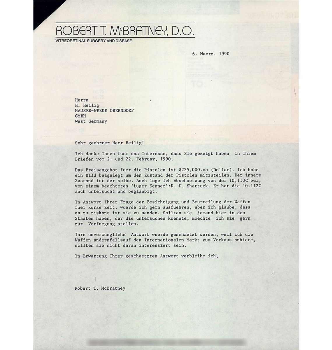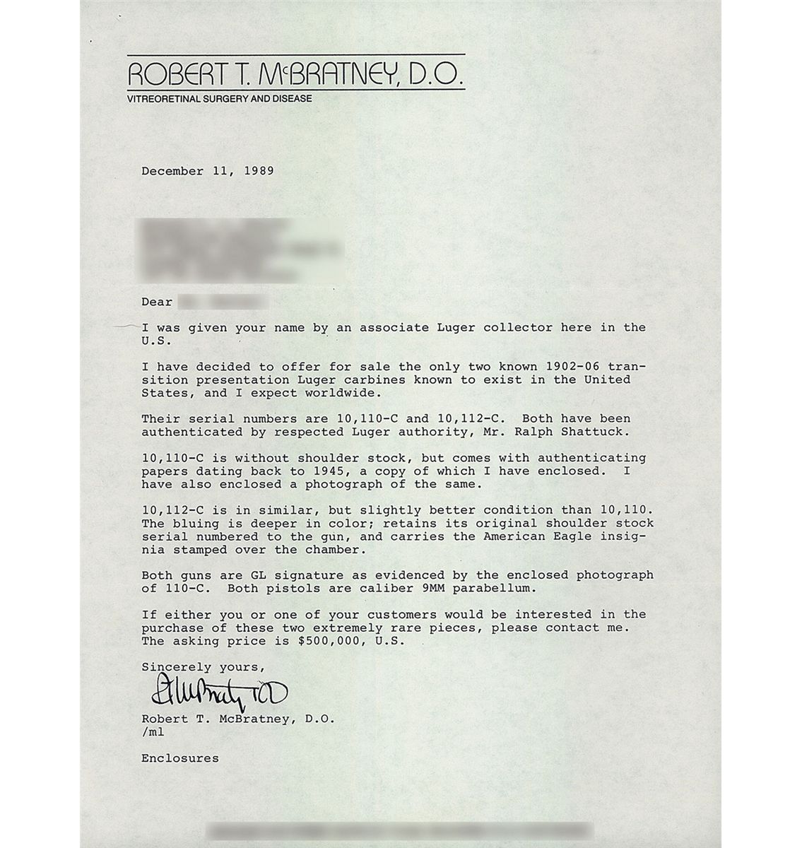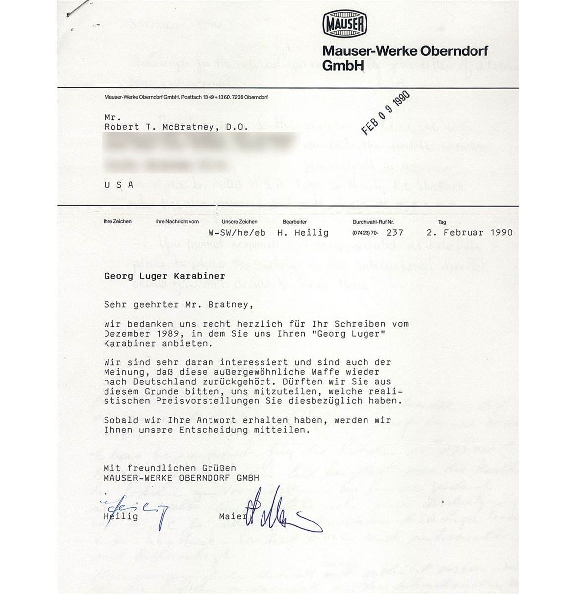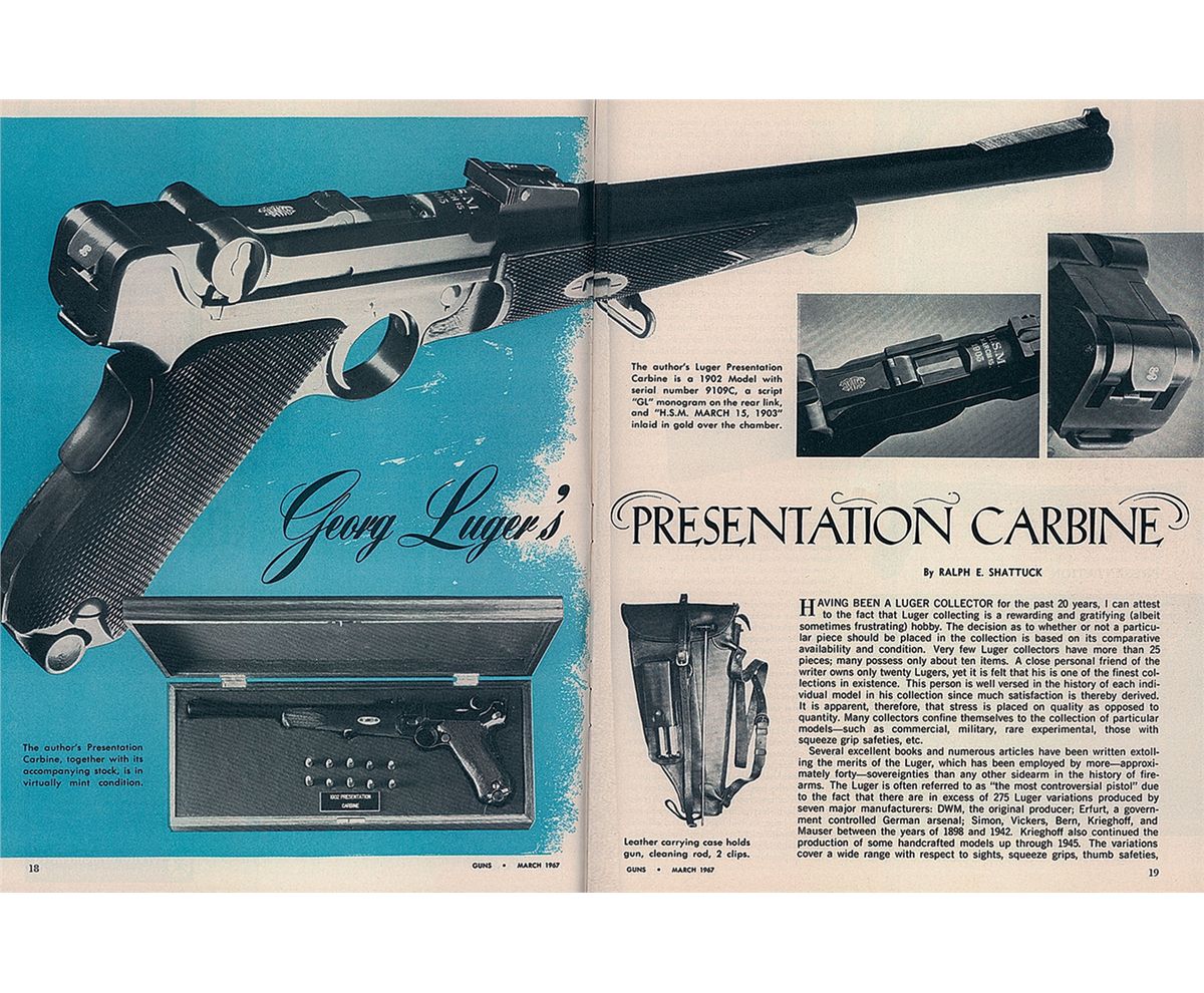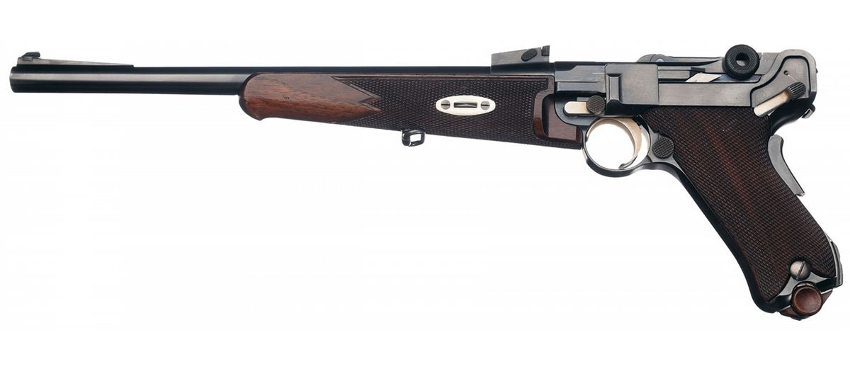 This is a beautiful example of a "One-Of-A-Kind", completely original and authentic "Georg Luger" marked Model 1902/06 Prototype Transitional Luger carbine in the unbelievable rare "9mm" caliber. I am sure that some of you are saying, "Rare 9mm" Luger caliber? How can that be rare when they made literally thousands of Lugers in 9mm. You are correct, for all standard Luger pistols, however the DWM factory only made "Two" known "1902 carbines" in 9mm Luger as 99.9% of all carbines were made in the standard 7.65mm Luger cartridge. That's why this is such a rare Luger pistol. As noted this pistol is fully supported by numerous documents and letters of authentication by several senior and well known Luger collectors, as well as a complete unbroken chain of ownership from the day it was captured by the veteran in Stuttgart Germany in late 1945 until today. The most notable features that set this beautiful original 1902/06 Luger carbine apart form all others is that it has the rare and unique "10,000" prototype serial number range reserved only for prototype pistols as produced by the DWM factory. Even more rare is that this pistol has the "C" suffix serial number designation clearly reserved for "Presentation-Prototype" Lugers and also this example has the ultra-rare intertwined "GL" monogram on the rear toggle clearly indicating that this super rare Luger pistol was made under the direct control of Georg Luger. Only Lugers made under his personal control, carry this "GL" monogram on the back side of the rare toggle and no others! As noted during the 1902 time frame almost all standard, commercial Lugers being produced were in the standard 7.65mm Luger cartridge. With development of the 9mm Luger cartridge all the European manufacturers were in the process of modifying their pistol to handle this improved cartridge, including the DWM factory. With this pistol having the unique serial number noted above and the special "GL" monogram we are certain that is what this pistol was developed for presentation to an extremely important customer or individual. The history of this unique Luger began, when it was captured in late 1945 in Stuttgart Germany by Private Elvin, he retained it until 1974, when it was sold to a noted dealer in California. From there it passed through several dealers and individual collectors, in the 1989/90 time frame when it was finally purchased by and retained by the current consignor. This extremely rare and unique pistol has been written and described in several magazine articles such as: "Guns" magazine March 1967; "Guns and Ammo" October 1974; and last the "American Rifleman" August 1980. This specific pistol has also been examined by and is accompanied by several letters of authenticated from several advanced Luger collectors such as Robert Simpson, (Simpson Ltd.), the late Ralph Shatutuck (World of Lugers) and Ken Kontos, (Midwest Firearms). The specific aspects of this unique and "One of a Kind" Luger pistol is that it has the original 11 7/8 inch carbine length barrel with the unique three position, sliding tangent rear sight soldered to the rear of the barrel. The sight is correctly marked, 1-3 indicating 100-300 meters. The underside of the barrel is correctly stamped with the serial number "10110" and it has been fitted with a completely unproofed or unmarked barrel extension, except for the matching serial number "10" on the underside of the extension, on top of the recoil lug. It has the 1906 style breechblock, flat 1906 style toggles with the standard "DWM" markings on the front toggle, with the noted "GL" monogram on the rear toggle. Both the left side of the breechblock and underside of the toggles are serial numbered "10". The frame is the improved 1906 style with the coil spring and grip safety. The front of the frame was correctly modified by the DWM factory with the addition of the forend hanger, which is also correctly serial numbered "100110. C". The pistol has the early style polished lower safety area with the "GELADEN" marked extractor. It has the original, and matching checkered walnut grips and the original checkered short forend. Another notable unique aspect of this Luger is that since it is chambered in 9mm Luger, the barrel does not require the small accelerator inside the forend as does those pistols chambered in 7.65mm. Consequently this pistol has had the original cutout inside the forend modified by the DWM factory by fitting a small wood insert in the cutout area where the accelerator would have normally fit. Again this was clearly done by the DWM factory as the color and grain of the walnut insert matches the forend perfectly and the joint is so tight it's almost invisible. Again 100% original to the DWM factory. This ultra-rare Luger is fitted with one nickel plated magazine with the wooden base that is stamped length wise "Cal. 9 M/M" over a single early DWM factory acceptance proof. This Luger obviously remained at the DWM/Mauser factory for some time as it has been modified with a hold open device inside the frame which was not developed/used until after 1913. As noted this extremely rare and certainly one of a kind Luger prototype pistol is accompanied by considerable supporting documentation, capture papers and letters from various noted Luger authorities. Also, of prominent note, it is photographed in detail on Page 208 (Figure 215) of Pistole Parabellum by Gortz/Sturgess. This is followed by lengthy discussion of this truly unique prototype New Model Carbine which further confirms this extraordinary Luger Prototype to be one-of-a-kind.