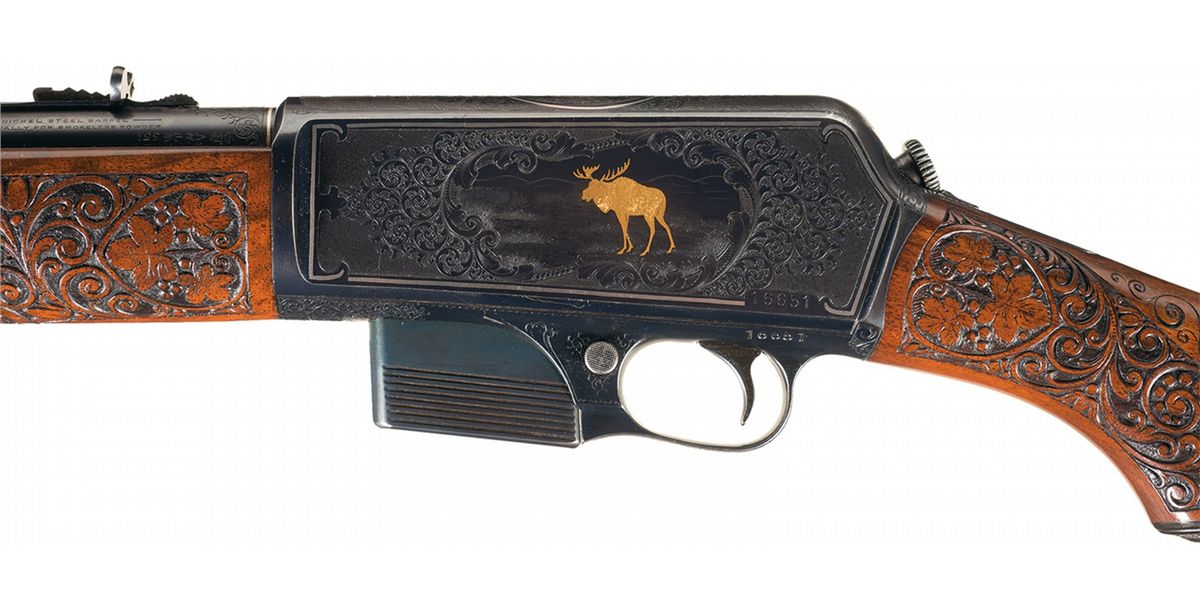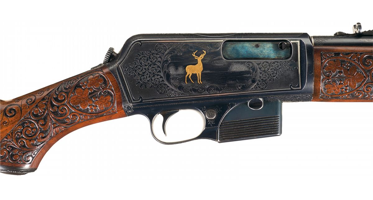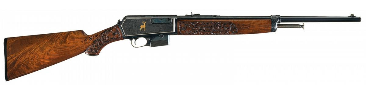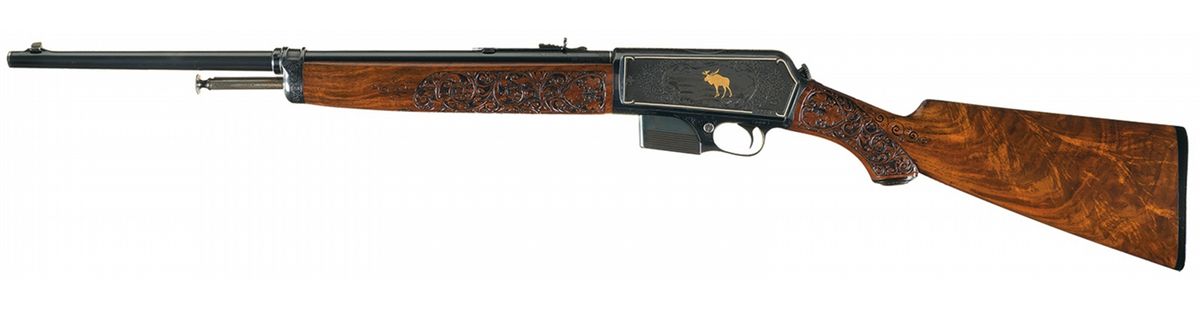 Documented Extraordinary Exhibition Grade Angelo Stokes Signed Factory Engraved Deluxe Winchester Model 1907 Semi-Automatic Rifle with Gold/Platinum Inlaid Game Scenes and Relief Carved Wood