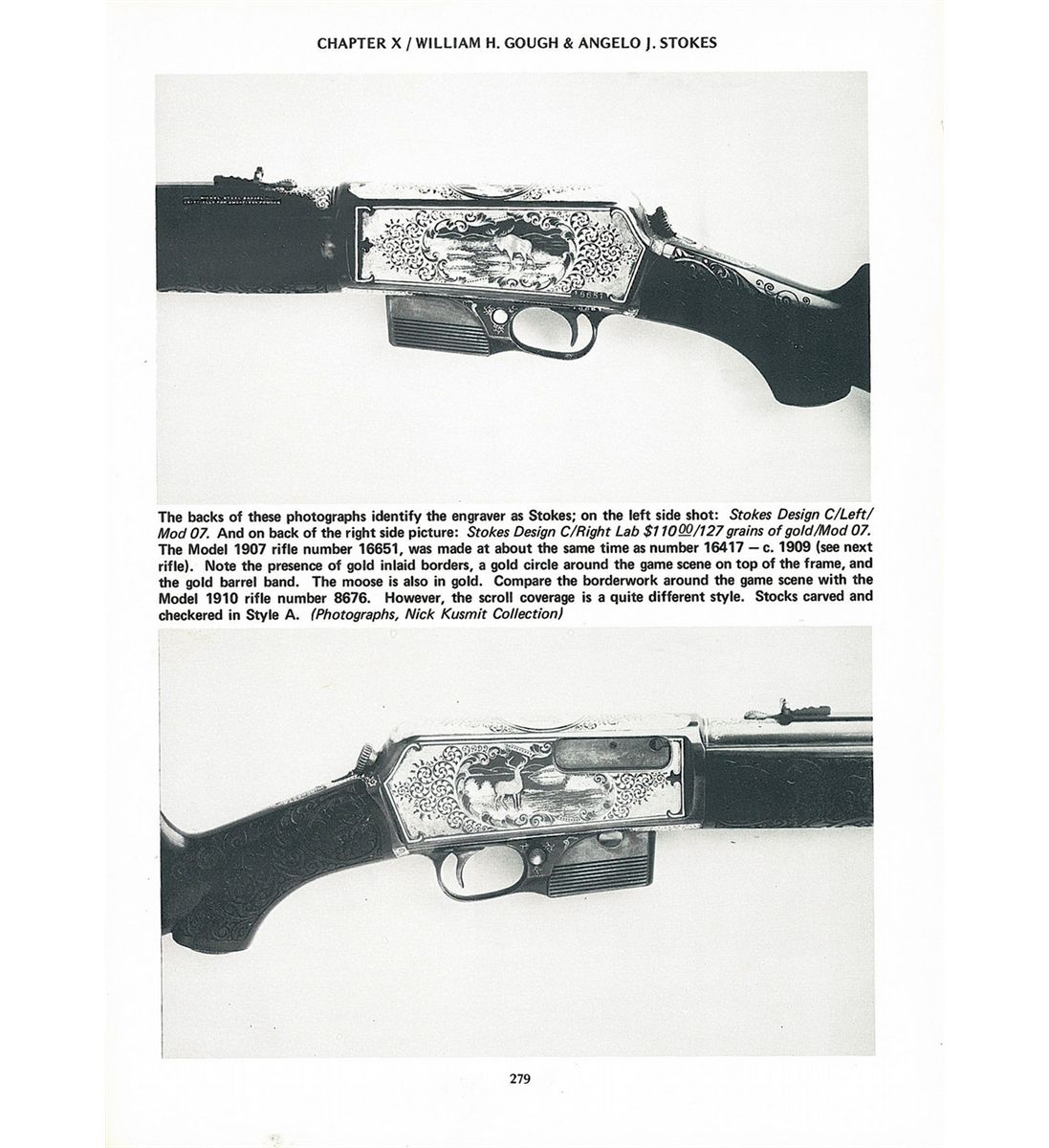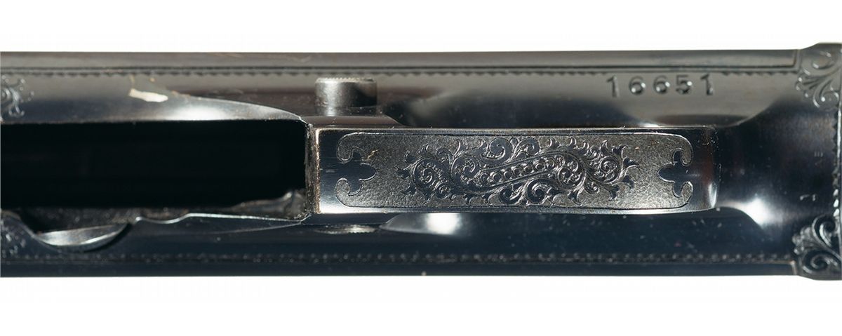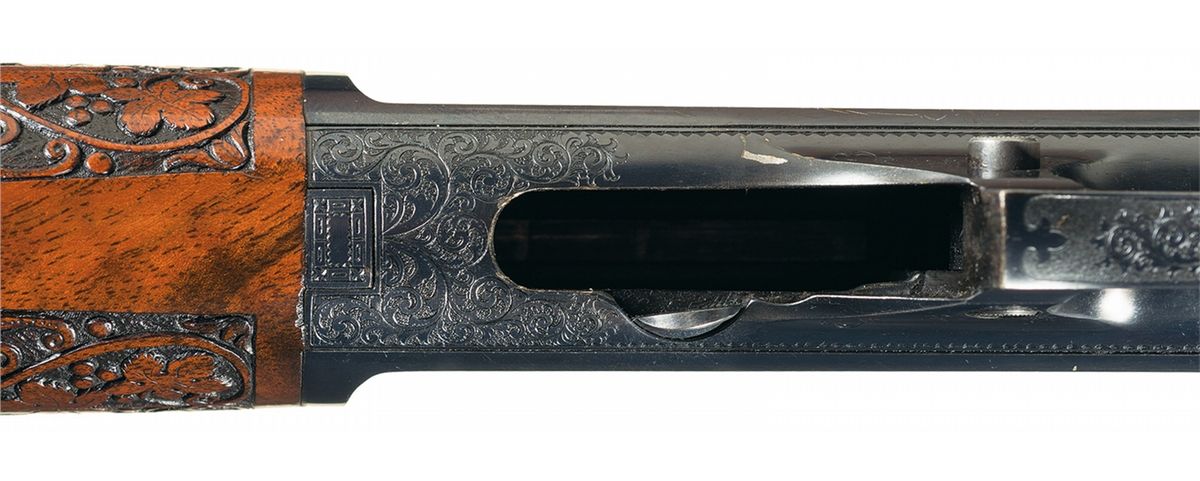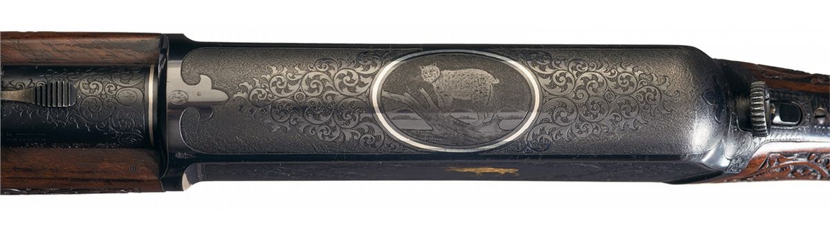 This is an exceptionally rare, all original deluxe exhibition grade factory engraved Winchester Model 1907, semi-automatic rifle that has been completely embellished by one of the most sought after Winchester factory engravers; Angelo Stokes who was know for his meticulous, highly detailed work. The Winchester factory records, note that several members of the stokes family worked for the Winchester factory CA.,1887-1922, with Angelo Stokes initial appearance in 1905. This exceptionally well engraved rifle is pictured on the top and bottom of page 279 of "The Book Of Winchester Engraving" by Wilson and has been signed by "Angelo Stokes" on the back side of the trigger guard with a extremely small "AS" initials. The engraving covers 95% of the action itself with both sides of the receiver and top, depicting an exceptionally well done and highly detailed game scene in a paneled motif with English scroll engraving around the outside edges of the panel scene with a silver engraved line around the edge of the receiver. The left side depicts a "Gold Inlaid" standing "Bull Moose" in a marsh scene with a "Gold Inlaid" standing "Bull Elk" in the same type of marsh scene on the right side. The back ground of both marsh scenes has been highly detailed to show reeds and grasses in the foreground with mountains in the back ground. The entire panel scene has a rough surface (not a punch dot) background. The top of the receiver has also been beautifully engraved with a matching engraved "Bobcat" inside a oval panel scene with the same platinum inlaid border around the scene as the side panels scenes. Also note (and not shown in the referenced book) is that the muzzle and breech end of the barrel, the forend cap, and lower receiver (underside of the actions) has also been highly engraved in a matching extremely fine English scroll engraving. In addition the muzzle and breech end of the barrel has also been inlayed with a single silver barrel band that matches the border around the edges of the receiver. This fabulous rifle has been stocked in a matching, highly figured 3X extra fancy walnut stock and forend that has also been hand carved in a superb and highly desirable Winchester "Factory A" pattern on both sides of the pistol grip and the sides and under side of the forend. This beautiful "Factory A" pattern carving is the highest and most intricate carving offered by the Winchester factory, that is as equally rare if not more so than the exquisite engraving that it compliments. This carving starts out with a large Heart that has three leaves inside the heart with berries surrounding the leaves, that is followed by a large flowing vine pattern, all intermingled inside the border areas. The pistol grip has also been capped with a hard-rubber Winchester grip cap and directly behind the pistol grip it is stamped "17447". The rifle itself was intended to be Winchester's new design offered in 1907. They were a fast handling semi-automatic rifles firing the high power cartridge "351 Self Loading" cartridge that became the favorites of many state and local police agencies. They were made from 1907 to 1937 and was a vast improvement over the Model 1905 rifle. The barrel is marked with the three-line, one-block Winchester factory address and patent dates that end in "06. followed by ".351 Cal." The left rear end of the barrel is also stamped with "NICKEL STEEL BARREL/ESPECIALLY FOR SMOKELESS POWDER". In addition this exquisite rifle also has "British Proofs" on the left rear side of the barrel directly below the barrel markings. These proof consist of the "Standing Lion/intertwined LP" for the London Proof House, next to the "Crown/V and Crown/G" proofs. Above these proofs it has a "Crown/GP" final proof and "351". Then directly at the junction of the forend line and barrel is stamped with the later "NP" proof for smokeless powder and what appears to be "CORDITE/the dram weight of the powder charge". The barrel is fitted with the standard half-nickel front sight with the adjustable sporting rear sight. This fantastic rifle is complete with two magazines, one five round and one ten round extended magazine.