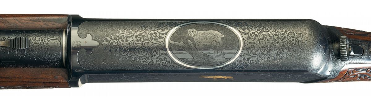 Excellent plus, with 99% of the original Winchester factory blue finish with all the platinum and gold inlays intact. The carved, extra fancy stock and forend are also both in exceptional condition with only a couple of very minor handing marks/very minute scratches with the carving all intact, highly detailed and exceptionally well done. A fabulous presentation grade rifle embellished by one of the more desirable Winchester engravers. Certainly for the super advanced high end Winchester collector. This is undoubtedly the finest example of this type we have ever offered at auction!