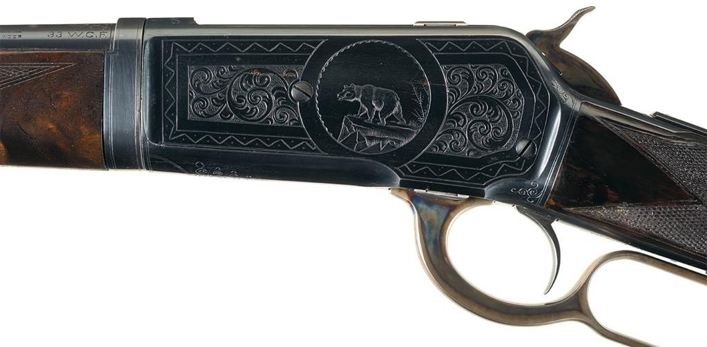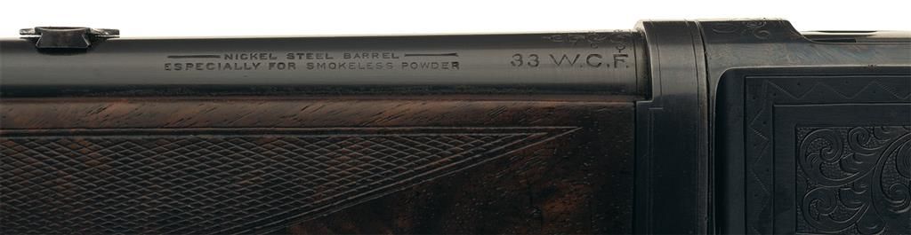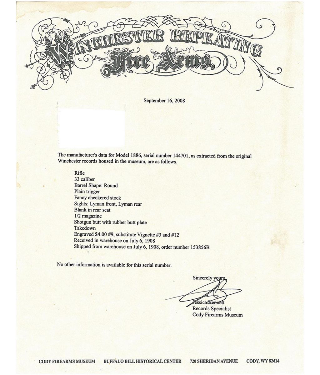Winchester Model 1886 Deluxe. Caliber 33 WCF, Extra Light-Weight Take-Down Rifle with Cody Firearms Museum letter.  The Cody letter lists the rifle features as: (1) "33 caliber". (2) "Barrel Shape: Round", (3) "Plain trigger", (4) "Fancy Checkered Stock", (5) "Sights: Lyman front, Lyman rear", (6) "Blank in rear seat", (7) "1/2 magazine", (8) Shotgun butt with rubber buttplate", (9) "Takedown", and (10) "Engraved $4.00, substitute Vignette #3 and #12". The letter states this rifle was shipped from Winchester on July 6, 1908. The rifle has a blue finish with color casehardened hammer and lever. The forearm cap, top of the barrel at the junction with the receiver, sides, top and bottom or the receiver and upper tang are factory engraved with a variation of the Winchester Style 9 engraving illustrated on page 219 of "THE BOOK OF WINCHESTER ENGRAVING" by R.L. Wilson. The left side of the receiver is engraved with a vignette of a grizzly bear and the right side is engraved with the vignette of a bighorn sheep (Vignettes # 3 and #12 on page 221 of "THE BOOK OF WINCHESTER ENGRAVING). The stock and forearm are deluxe, fancy grain walnut with Style H checkering and a subdued piano finish. The stock has a black, hard rubber, checkered, shotgun style buttplate with the Winchester logo embossed in the center. The barrel has a Lyman "Hunting front sight" with colored bead and a factory blank in the rear sight dove-tail. A Lyman folding combination rear sight is mounted on the receiver tang. The left side of the barrel is roll-stamped: "MANUFACTURED BY THE WINCHESTER REPEATING ARMS CO./NEW HAVEN. CONN. U.S.A. PAT. OCT. 14. 1884. JAN. 20.1885." in two-lines ahead of the rear sight dovetail and "-NICKEL STEEL BARREL-/ESPECIALLY FOR SMOKELESS POWDER" in two-lines behind it. The caliber designation "33 W.C.F." is roll-stamped on the left side of the barrel immediately ahead of the take-down collar. The lower tang is roll-stamped with the 1884 and 1885 patent dates behind the trigger and the serial number "144701" behind the rear tang screws.