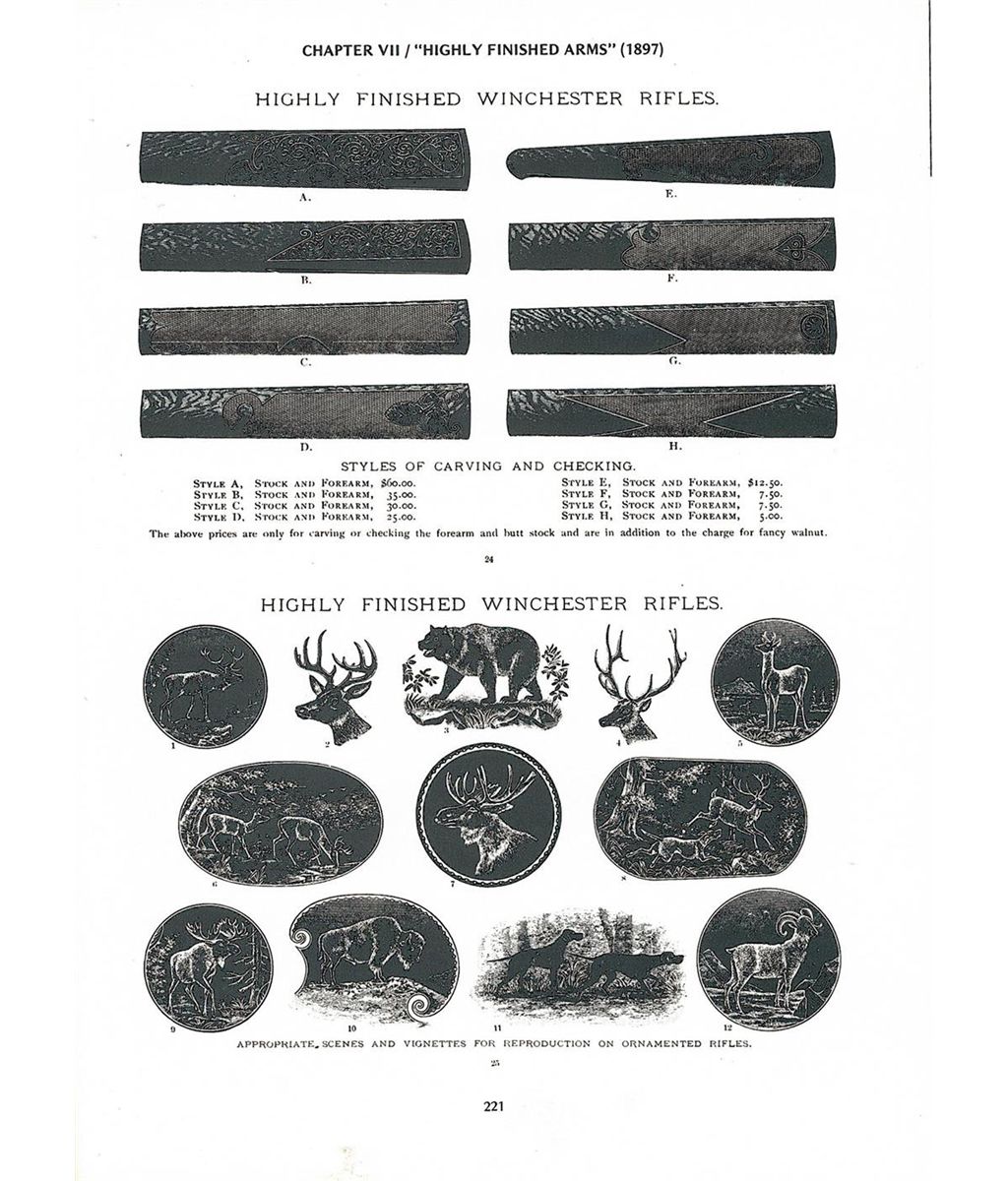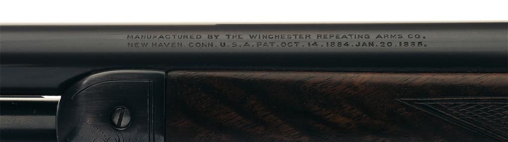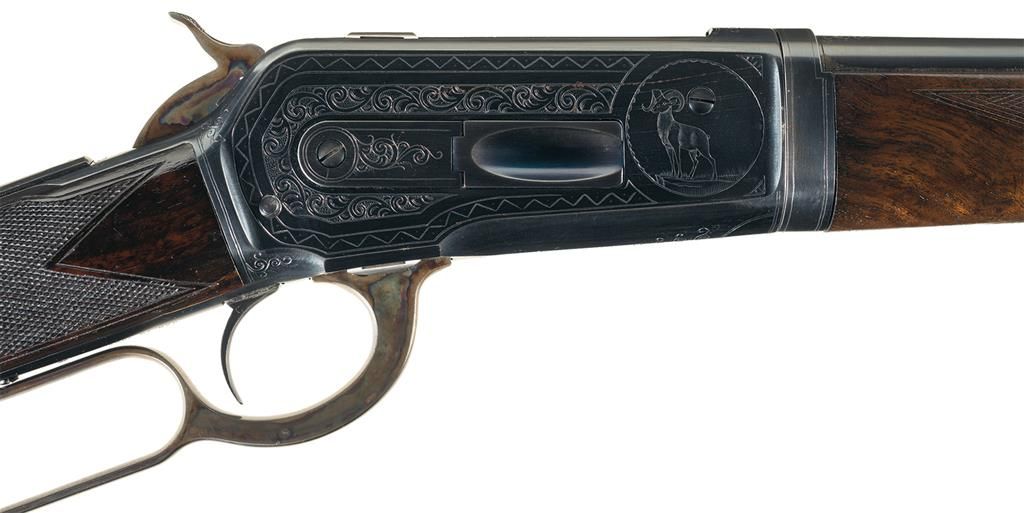 Very fine as period refinished. The rifle retains 95% of the blue and casehardened finish. There are several shallow scratches and some very light finish wear on the right side of the receiver and takedown collar near the bighorn sheep vignette. The blue finish on the left side of the take down collar is thin. The case colors on the hammer and lever are bright. The stock and forearm are both in very fine condition. The stock has some finish loss on the wrist at the junction with the receiver and some scattered and very minor handling marks. The forearm shows handling wear at the junction with the take-down collar and retains about 85% of the original finish. The checkering on the forearm shows some handling wear. The engraving, particularly the well executed game vignettes, is crisp. This is an outstanding representative example of a scarce factory engraved, Winchester Model 1886 Deluxe .33 Caliber Extra Light-Weight Take-Down Rifle.
