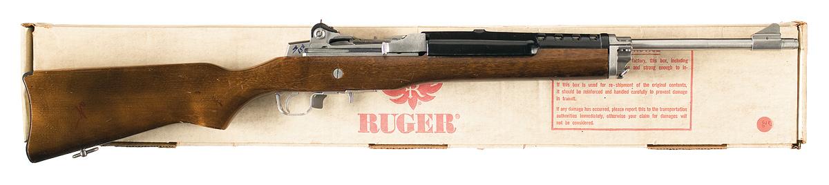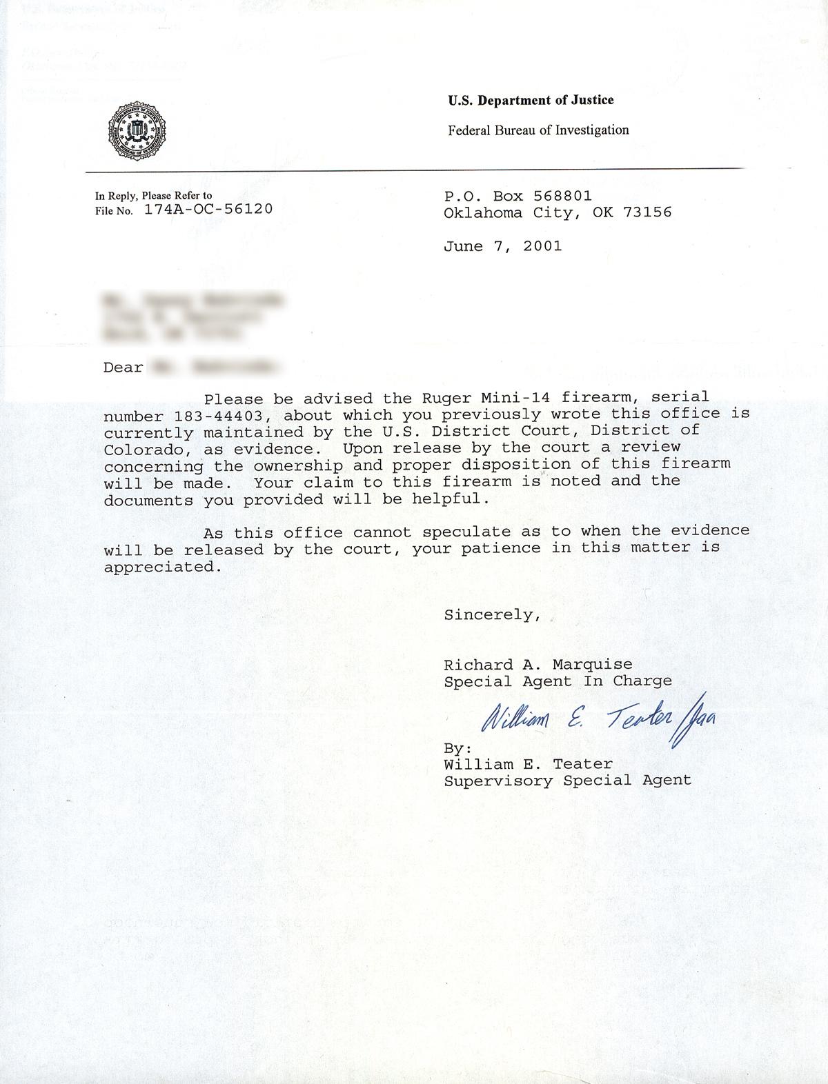 This Ruger Mini 14 semi-automatic carbine was originally purchased in 1983 and is one of about a dozen guns stolen from the original owner who lived in Enid, Oklahoma. The robbery took place in 1985. By the early 1990s, all of the missing guns had been found and returned to the original owner with the exception of this carbine. In the aftermath of the April 19, 1995 Oklahoma City Bombing law enforcement agents found this carbine (18344403) inside Terry Nichols' home in Kansas. Terry Nichols conspired with Timothy McVeigh in the bombing of the Alfred P. Murrah Federal Building in Oklahoma City, Oklahoma, on April 19, 1995. The Oklahoma City Bombing, by which the event became known, claimed the lives of 168 people. For his role in the bombing, Terry Nichols was convicted of conspiracy to use a weapon of mass destruction and eight counts of involuntary manslaughter by a federal jury in Colorado. He was sentenced to life imprisonment without the possibility of parole in ADX, a supermax security prison near Florence, Colorado. He was returned to Oklahoma to face state chargers of 161 counts of first degree murder (included one count of fetal homicide), and in 2004, was sentenced to 161 consecutive life terms without the possibility of parole. Starting in 1995 the original owner of this carbine initiated a letter writing campaign in hopes of having the gun returned to him. Due to the his persistence and assistance from representatives in the U.S. congress and in the Oklahoma legislature, the carbine was returned to him in early 2006. (Some of the letters written between the owner and the U.S. Department of Justice concerning the return of this carbine and the FBI item release form are included in this lot). The carbine still bears FBI evidence markings in felt pen on both sides of the receiver and stock. The carbine has the standard Ruger markings, with a blade front sight, a rear peep sight, plastic upper handguard, sling swivels, and a smooth pistol grip stock. Complete with the original factory box numbered to the gun and a 20 round magazine (box and magazine were not taken when the gun was stolen). Included are the following accessories that were purchased by the original owner before the carbine was stolen: a stainless steel muzzle break, Weaver scope base with rings, and a black nylon sling.