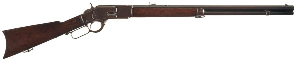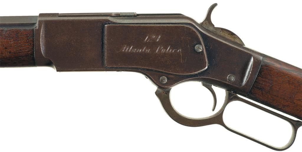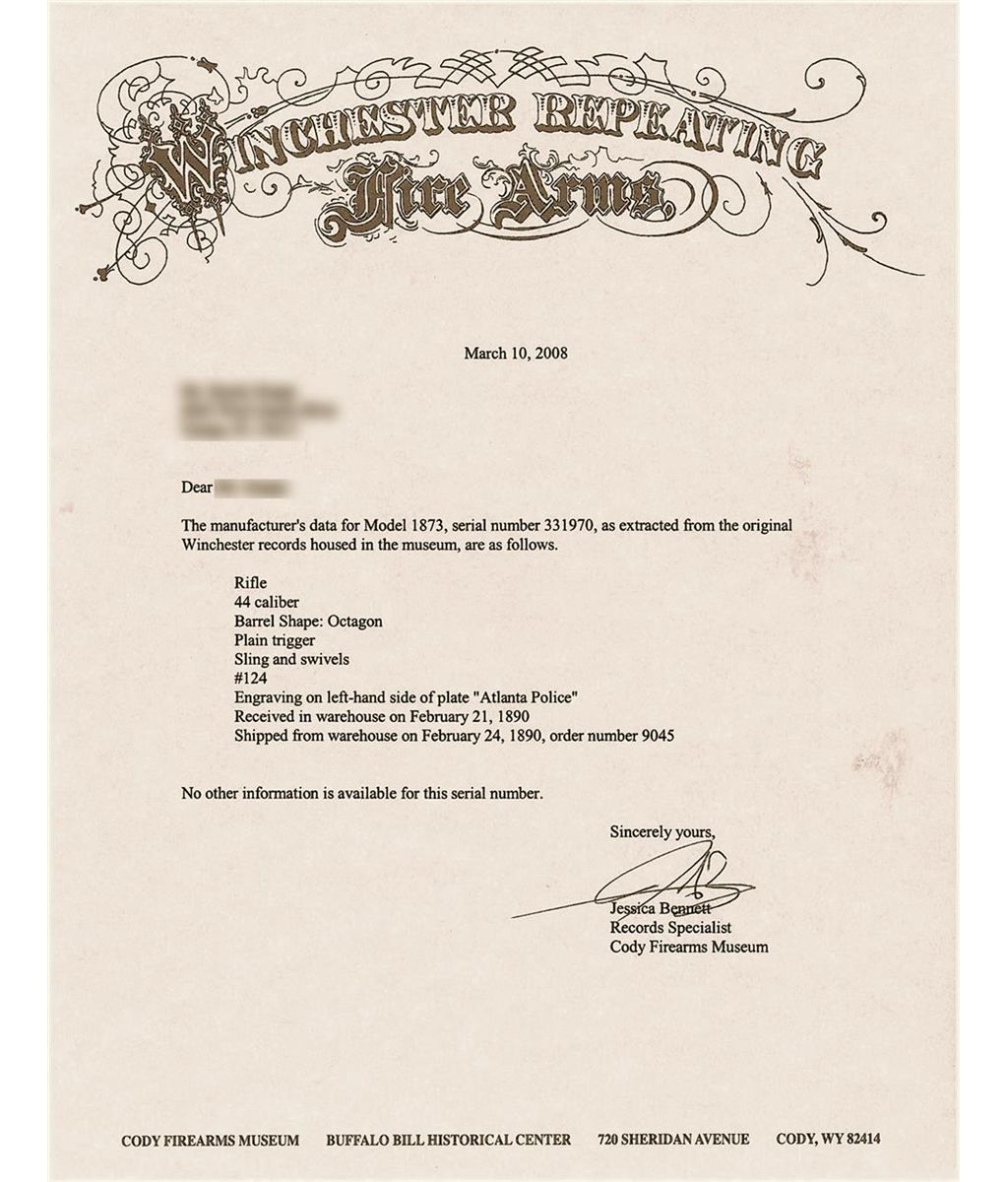 Manufactured in 1890, this rifle is 1 of a group of Winchester Model 1873 rifles with 44 caliber octagon barrels purchased by the Atlanta Police Department in the late 1880s. All were factory inscribed "Atlanta Police" with a large number above on the left side plate and were equipped with sling swivels. This particular rifle has the large number "124" above the inscription. Dovetailed blade front and adjustable buckhorn rear sights with the top barrel flat marked with the two line address/King's improvement patent dates ahead of the rear sight and "44 W.C.F." at the breech. The upper tang is marked "MODEL. 1873" flanked by the decorative foliate design, the serial number is at the rear of the lower tang and the bottom of the brass cartridge elevator is marked "44 CAL." Full magazine tube and mounted with a smooth walnut forearm and straight grip stock with forend cap and crescent buttplate with compartment (cleaning rod not included). There is a sling swivel mounted on the forend cap and on the stock. The factory letter verifies the configuration, "Atlanta Police" engraved #124, that it was received in the warehouse on February 21, 1890 and shipped to order number 9045 on February 24, 1890. This rifle is 1 of 2 being sold in this auction that were shipped to the Atlanta Police Department on the same day to the same order number and having serial numbers 5 numbers apart.