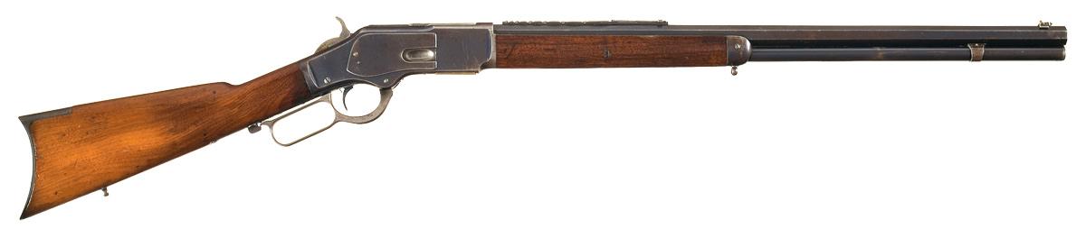 Manufactured in 1897, this Third Model has the distinctive integral dust cover rail machined to the top of the receiver and has the standard two line address reading "WINCHESTER'S-REPEATING-ARMS.NEW HAVEN.CT. / KING'S-IMPROVEMENT- PATENTED-MARCH 29. 1866. OCTOBER 16. 1860." The left side at the breech is marked "44 W.C.F.". The serial number appears on the lower tang and model designation is on the upper tang. The brass elevator is marked "44 CAL". The rifle features the following special order parts; folding Beech globe front sight, seven leaf folding express rear sight and single adjustable set trigger. The rifle is fitted with a plain forearm with a steel end cap and straight grip stock with a steel crescent buttplate with buttstock compartment. Sling eyes have been added to the stock and end cap. The barrel, magazine and receiver are finished blue while the lever, hammer and buttplate are casehardened. The rifle is accompanied by a Cody Museum document dated 1/9/07 listing this as a rifle in 44 caliber, octagon barrel, set trigger and Beech and seven leaf express sights. Remarks state "screw eyes". Many of these scarce seven leaf sight guns were used in Africa for large game hunting. Seldom seen in the U.S.