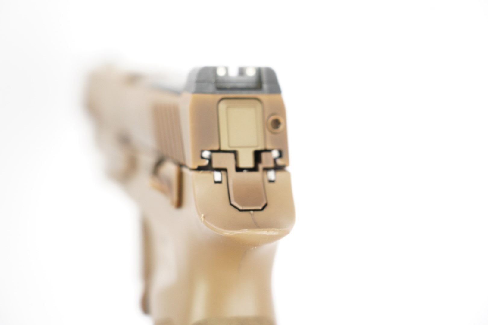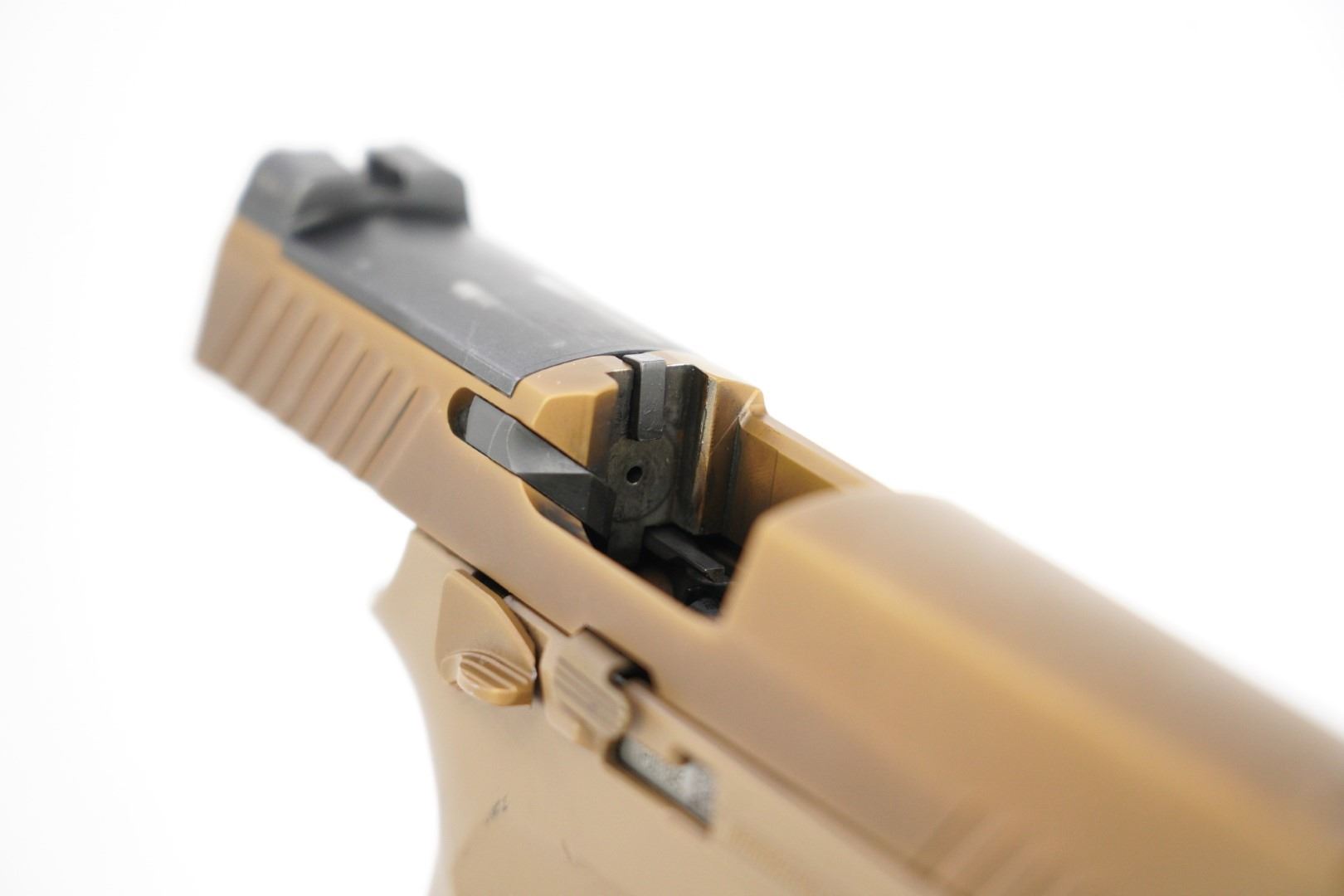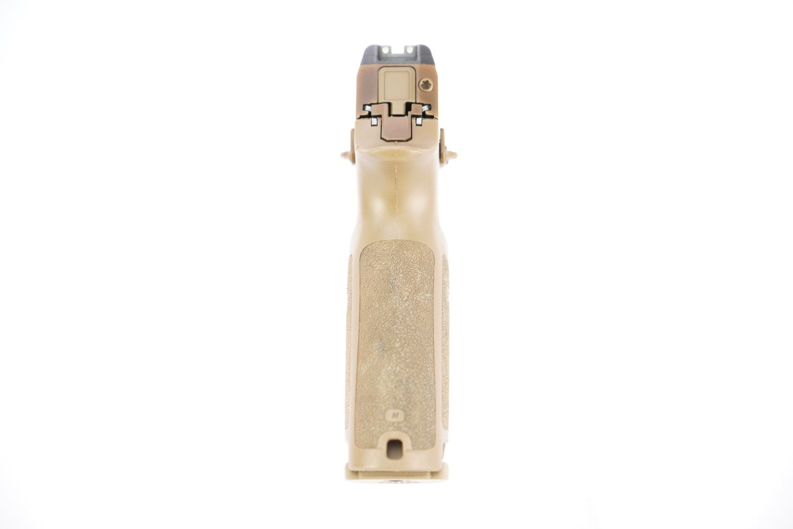 Sights / Optics: The front sight is a blade with a green lamp dovetailed to the front of the slide. The rear sight is a square notch with two amber lamps mounted to the optic cover plate. The cover plate can be removed for mounting an optic (none present).