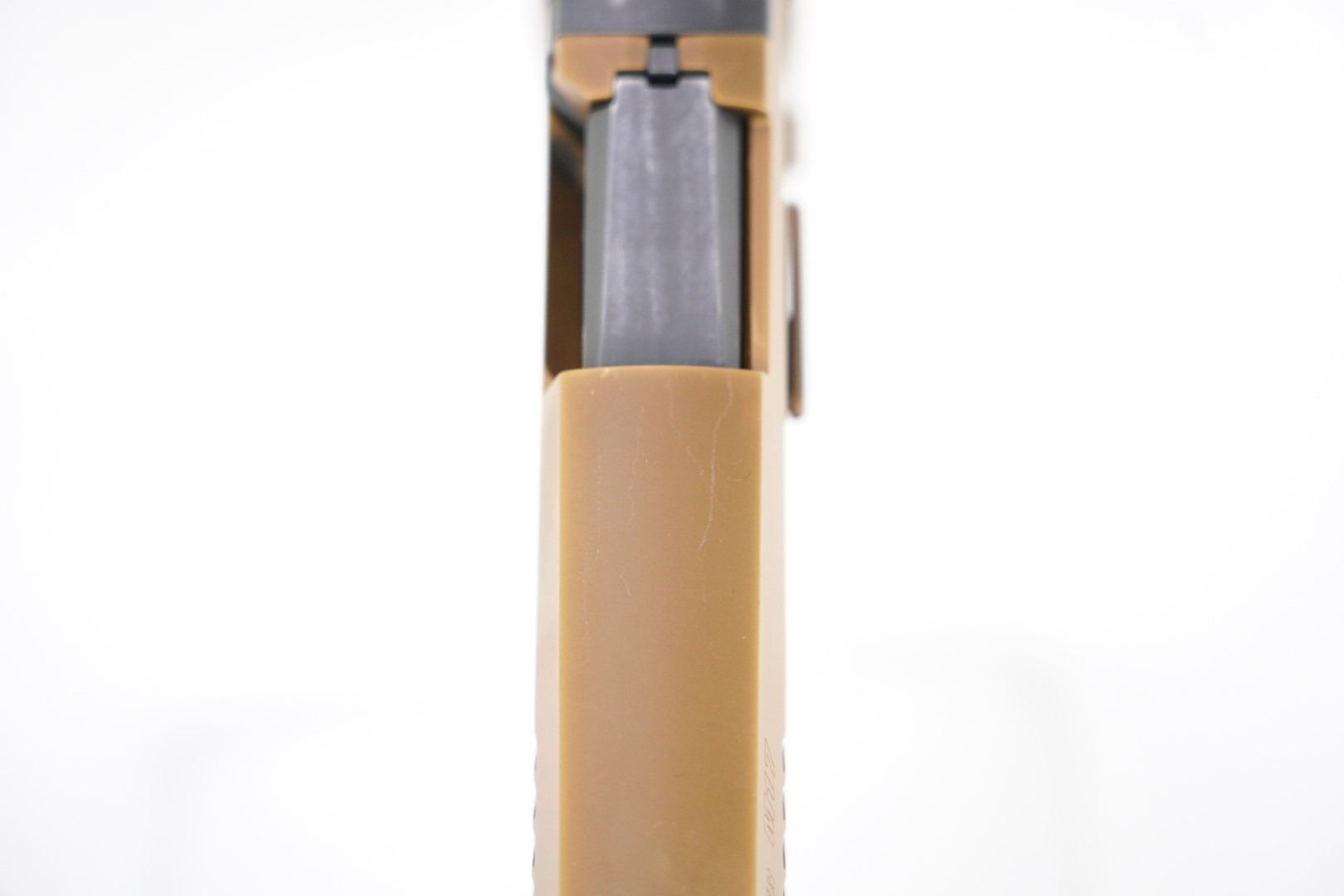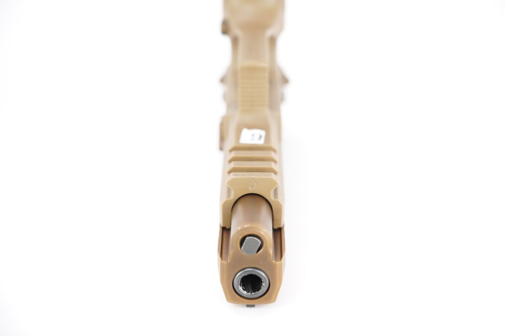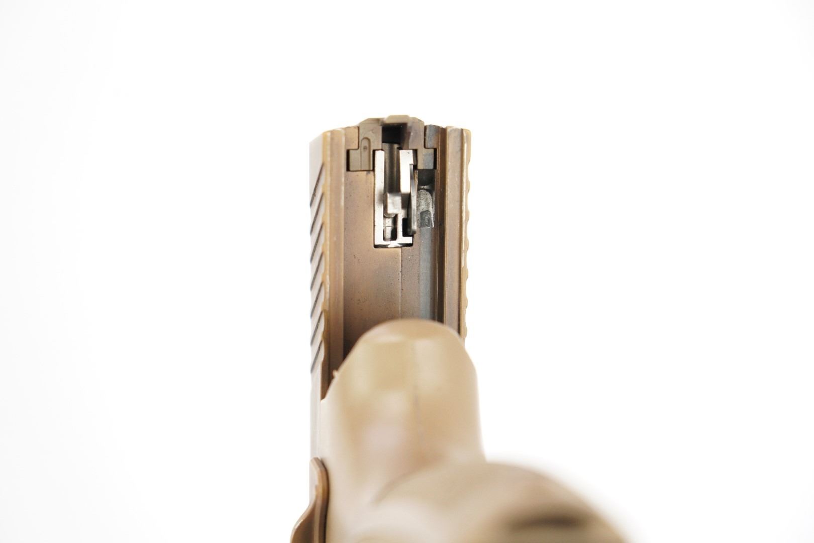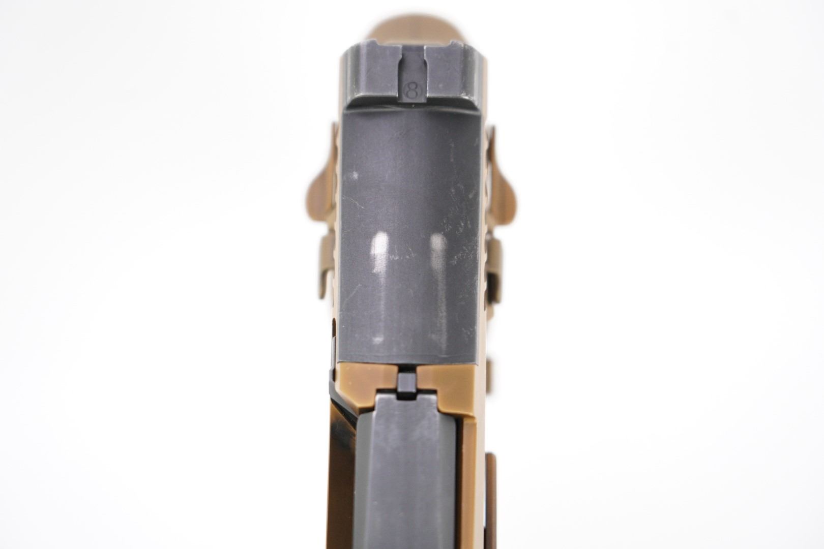 Sights / Optics: The front sight is a blade with a green lamp dovetailed to the front of the slide. The rear sight is a square notch with two amber lamps mounted to the optic cover plate. The cover plate can be removed for mounting an optic (none present).
