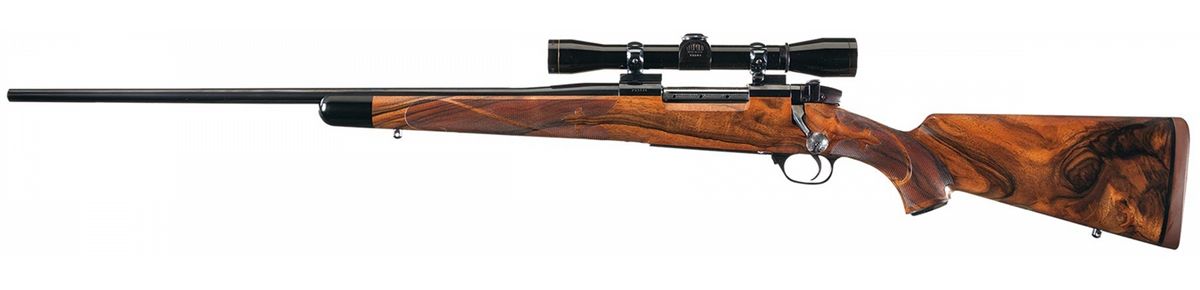 This particular rifle was once owned by David Petzal the Managing Editor of Field and Stream magazine. In a letter Mr. Petzal states that the rifle was a plain Mark V in 270 WM caliber that he hunted with in Montana in 1973. He did not care for the 270 caliber and had the rifle rebarreled at Weatherby in the current 300 magnum. He also replaced the factory trigger with a Canjar. The stock has been custom made by Winston Churchill. The stock is made of New Zealand walnut with fancy Fleur-de-Lis fine 28 lpi checkering on the forearm and wrist. Ebony forend, floral scroll engraved metal grip cap, cheekpiece. Solid Pachmayr Old English recoil pad, sling swivel studs and "D/E/P" inscribed gold initial oval. Petzal states that after the rifle was rebarreled and restocked he never hunted with it, fired it very little and sold it sometime in the 1980s. This rifle is pictured and described on pages 41-45 of the book "Contemporary American Stockmakers" by Ron Toews, it is pictured on page 154 of "The Modern Rifle" by Jim Carmichel, and is pictured and described in two editions of Field and Stream. All the literature accompanies the rifle. The receiver has the standard markings, barrel manufactured without sights, all blue finish, jeweled bolt and follower, hinged floor plate and equipped with a Leupold M8-4X scope on Redfield bases.