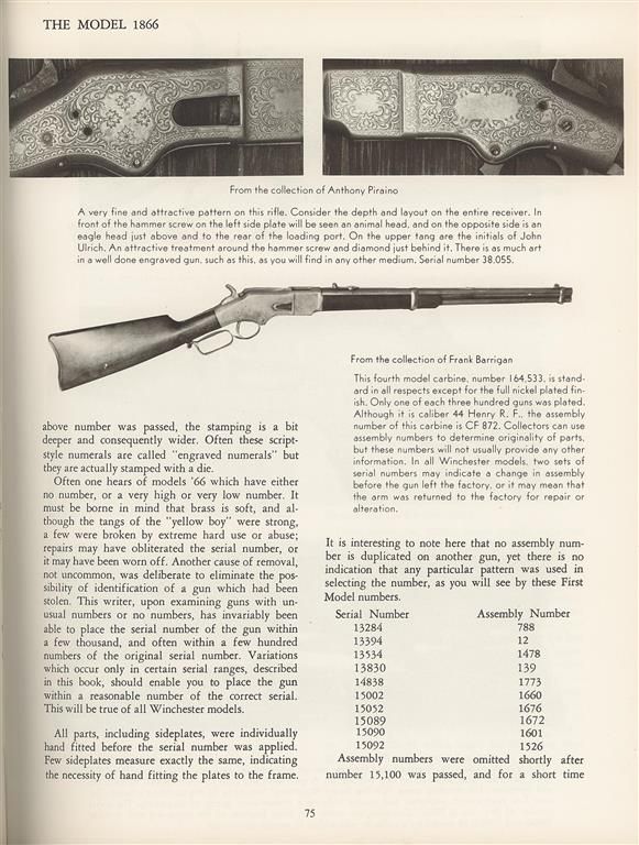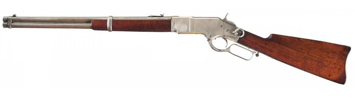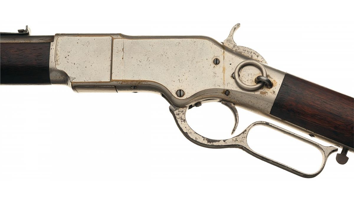 Winchester Model 1866 Carbine manufactured in 1885. The carbine has a very scarce factory full nickel plated finish. This carbine is pictured and described on page 75 of "THE WINCHESTER BOOK" by George Madis. Madis states that "only one of each three hundred guns was plated". The carbine has a barrel band ahead of the iron block front sight and late pattern folding leaf rear sight. A staple-mounted saddle ring is located on the left side of the receiver. The iron carbine-style buttplate has a sliding trap (cleaning rod not included). The stock and forearm are straight grain black walnut. The top of the barrel is roll-stamped "WINCHESTER'S-REPEATING-ARMS. NEW HAVEN. CT./KING'S-IMPROVEMENT-PATENTED-MARCH 29. 1866. OCTOBER 16. 1860" ahead of the rear sight. The serial number, "164533" is stamped in script numerals on the lower tang behind the lever latch.
