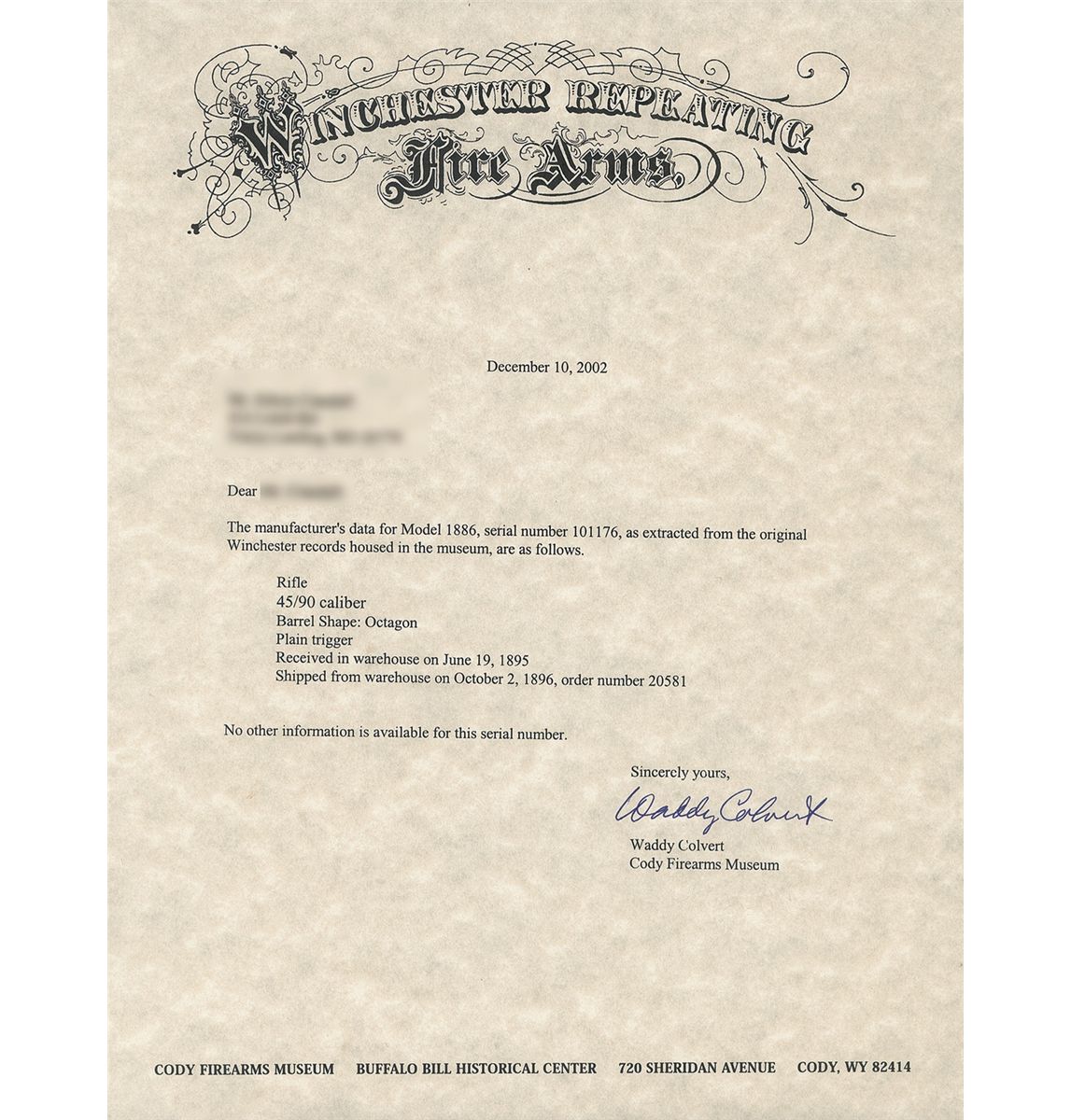 This is an exceptionally nice all original Winchester Model 1886 rifle manufactured in 1895 in the "45-90" cartridge with a full octagon barrel and full length magazine tube. This beautiful rifle is accompanied by a Winchester letter dated Dec 2002 that verifies the exact configuration of this rifle. The top barrel flat is marked in two lines: "----MANUFACTURED BY THE----/----WINCHESTER REPEATING ARMS CO. NEW HAVEN. CONN. U.S.A-----", with the breech end of the barrel marked "45-90 W.C.F.". The 1884 and 1885 patent dates are marked on the lower tang behind the trigger with the serial number towards the rear end. The barrel is equipped with the Winchester half nickel sporting front sight and a Winchester adjustable buckhorn type rear sight. Standard walnut buttstock, crescent buttplate and walnut forend with steel nose cap. Blue barrel, magazine tube and bolt with casehardened finish on the remaining metal surfaces.