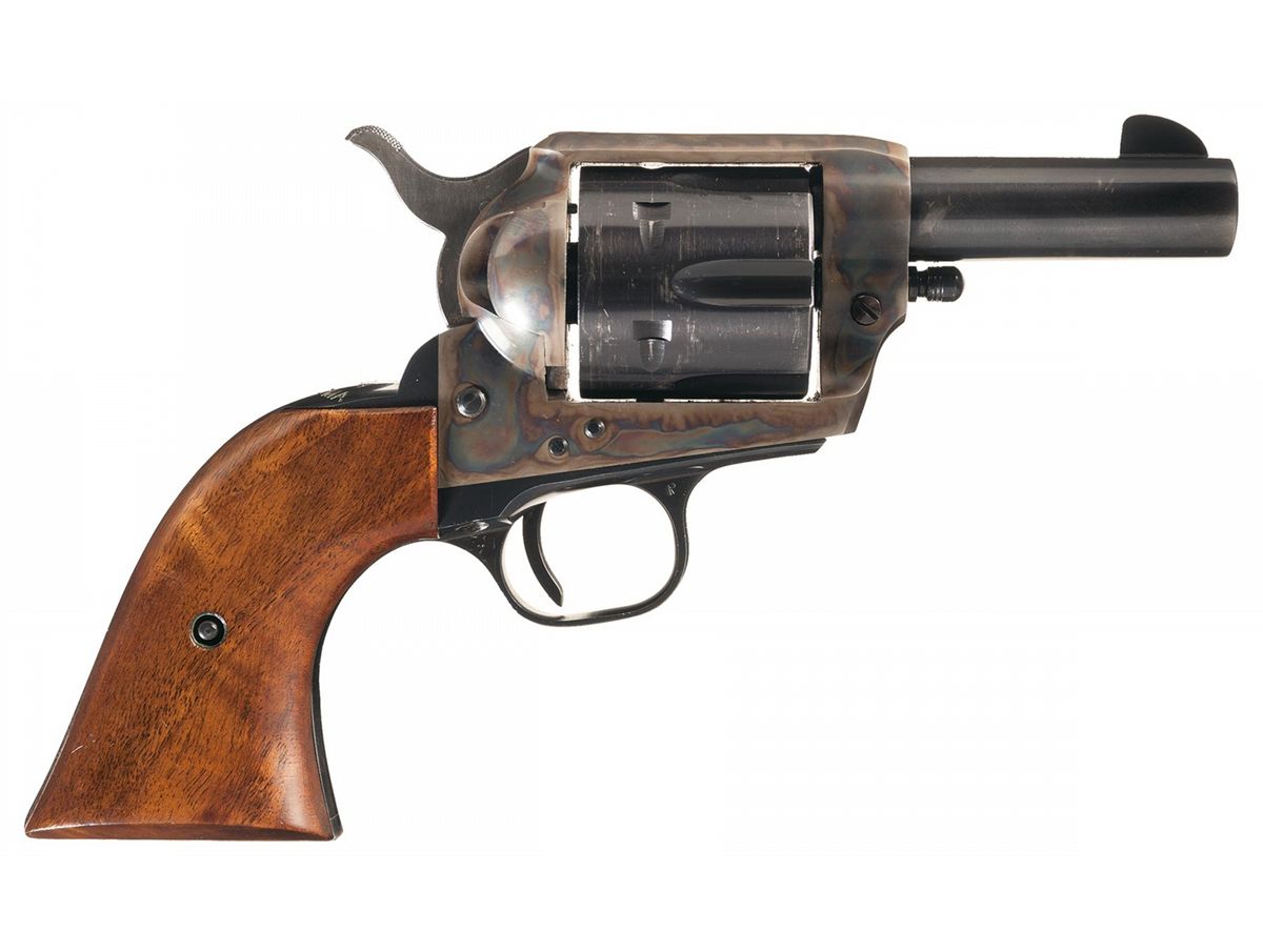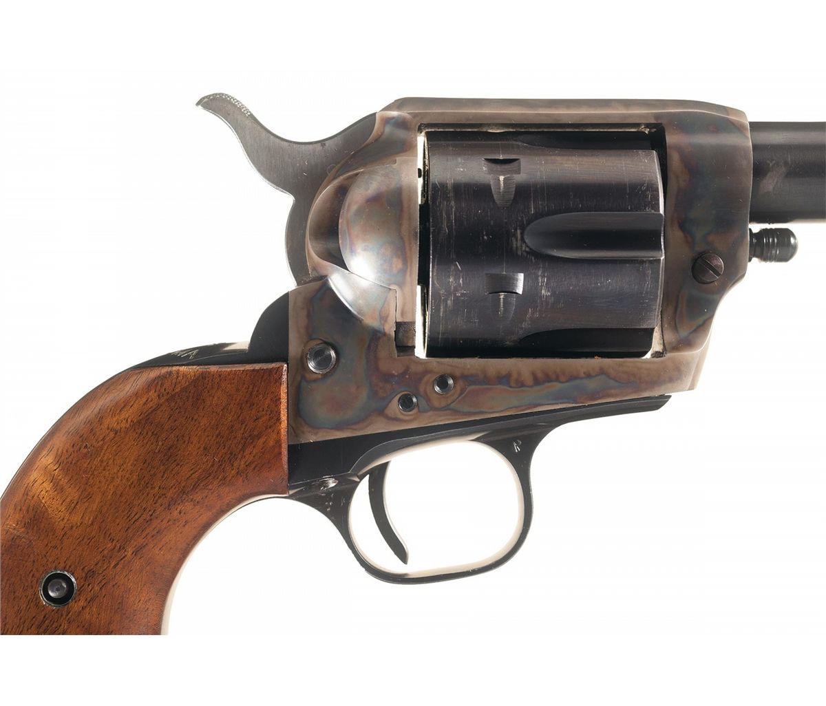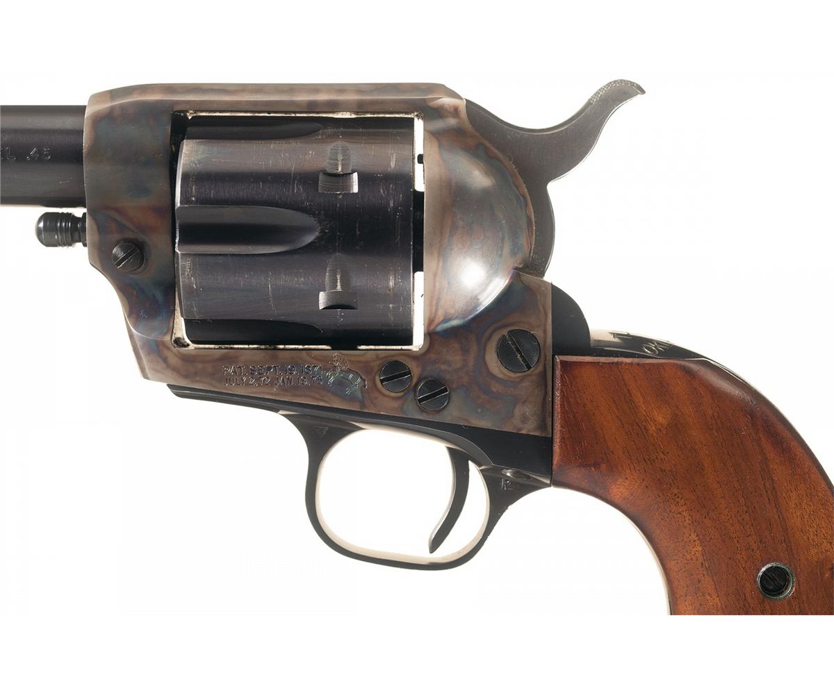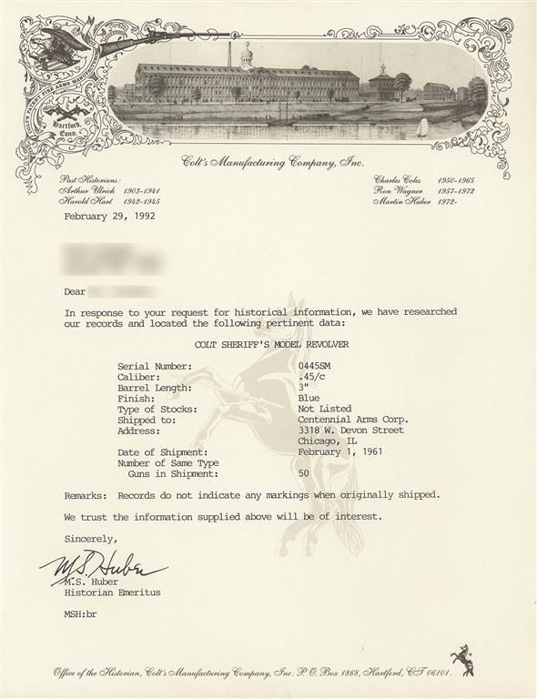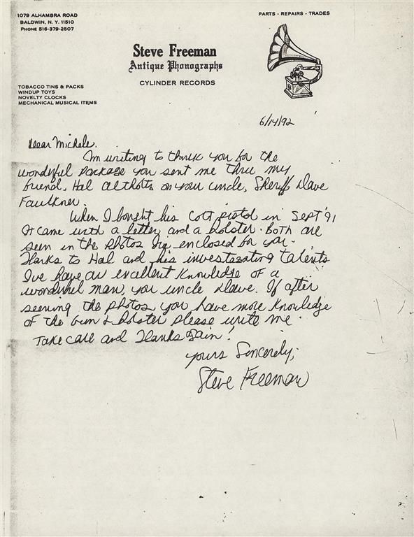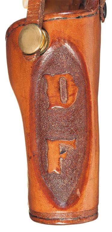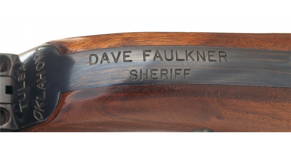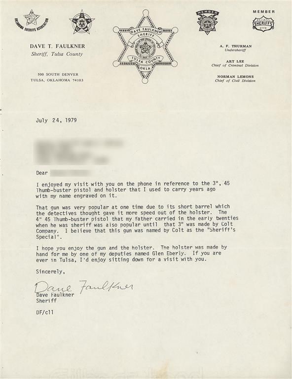 This is one of approximately 500 Colt Sheriff's Model Single Action Army Revolvers with the "SM" suffix serial number that were manufactured from 1960 to 1975 with this example once belonging to a Tulsa Sheriff. The included Colt factory letter confirms the caliber, barrel length and finish with the type of stocks not listed. The revolver was shipped to Centennial Arms Corp. Chicago, IL on February 1, 1961 as part a 50 gun shipment. The first of these revolvers were marketed by Centennial Arms. The revolver has standard Colt barrel and frame markings with an inscription on the back strap "TULSA/OKLAHOMA" and "DAVE FAULKNER/SHERIFF". The grip straps and smooth walnut grips are numbered to the gun. A letter addressed to Deputy Sheriff John Nelson of Tomay, California, from Sheriff Dave Faulkner dated 1979 confirms that the revolver was once carried by Faulkner and that the holster in this lot was handmade by one of Faulkner's deputies. The open top/open toe leather holster has deeply tooled stacked initials "DF" along the front. Research pertaining to Faulkner's career as a sheriff is also included with the gun. Retiring in 1982, Faulkner served as Tulsa County Sheriff for 23 years with a total of 44 years in law enforcement. During his tenure, Faulkner transformed the Tulsa County Sheriff's Office into the largest in the state of Oklahoma. He was held in high regard with one friend commenting, "As a politician [Faulkner] was perhaps the most popular figure to ever run for local office."