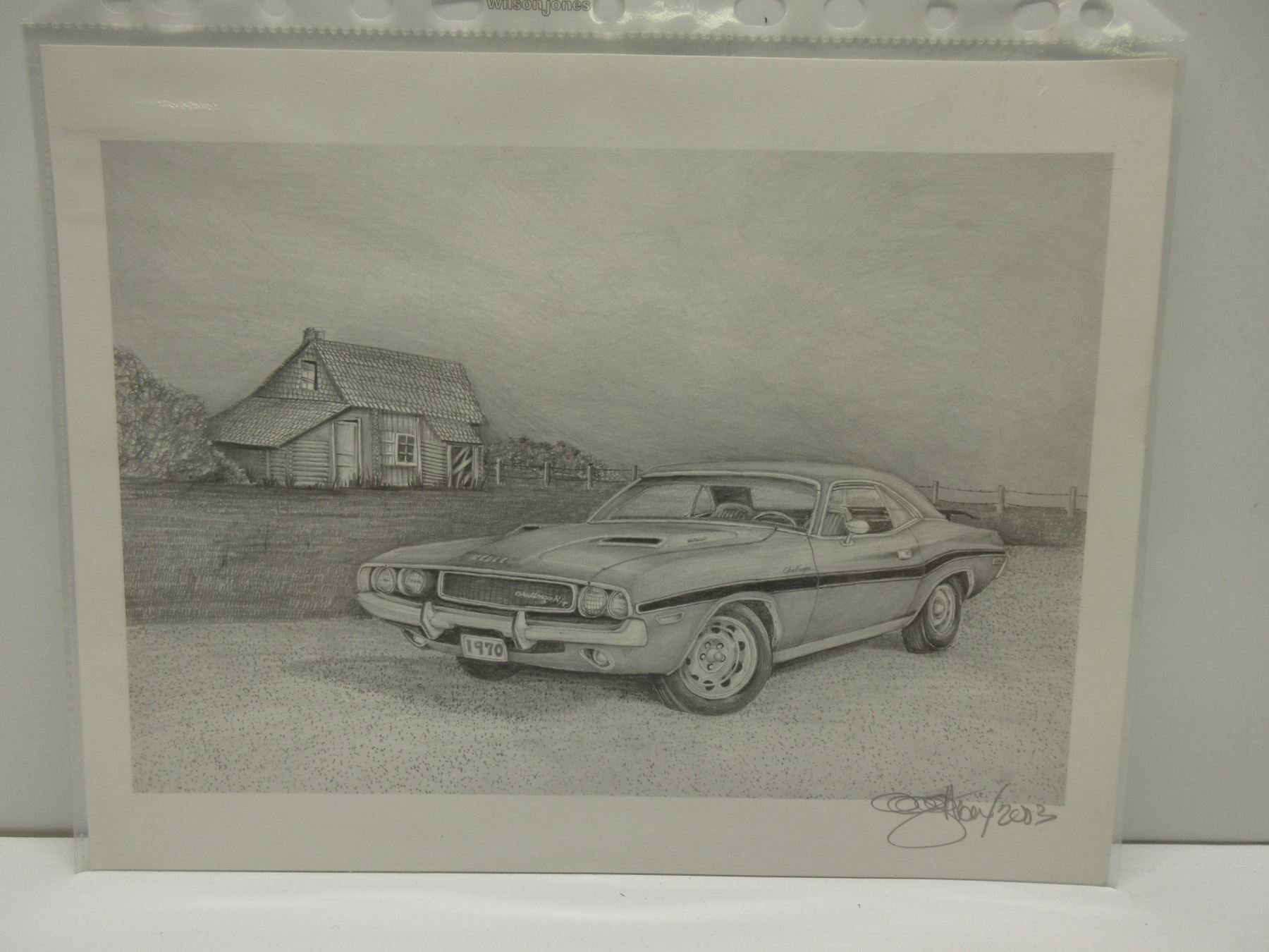 Dodge Challenger Artwork pencil drawing signed 2003 in plastic cover