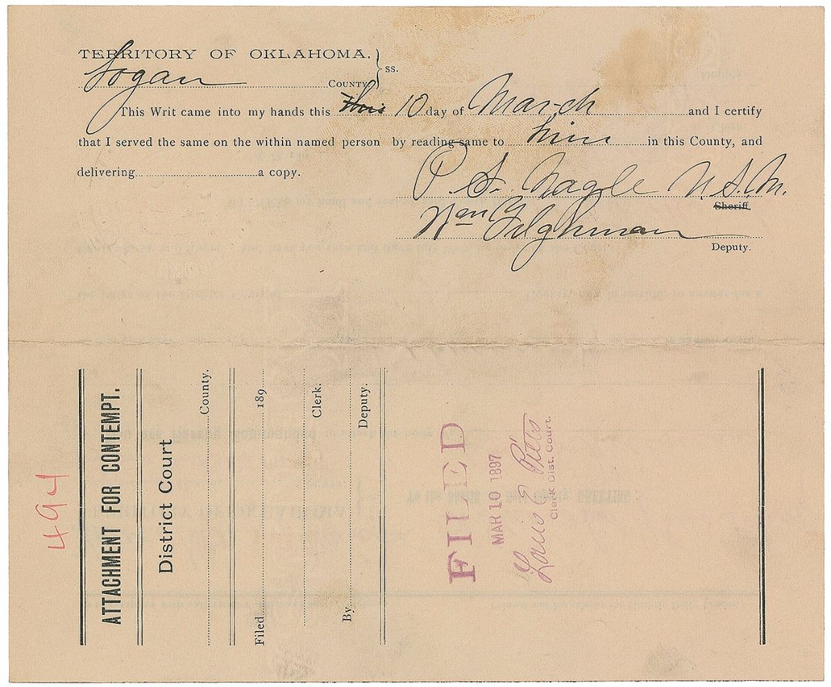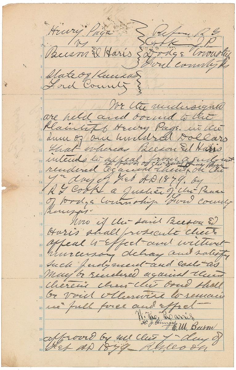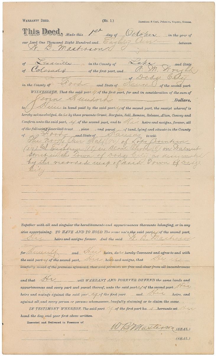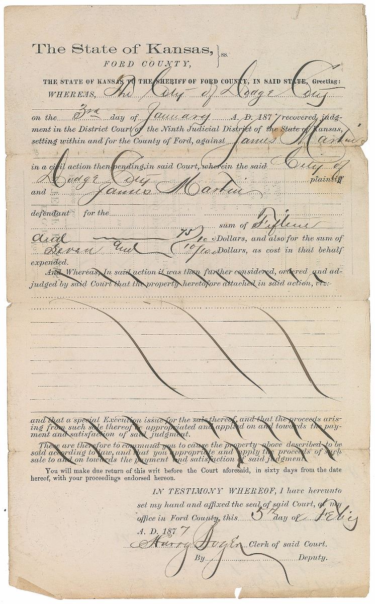Collection of six documents from the Wild West days of Dodge City, Kansas, including: an order of attachment, June 3, 1875, signed twice by legendary Dodge City lawman and saloon owner Charlie Bassett; an attachment for contempt document issued in Logan County, Oklahoma, March 10, 1897, signed by famed gunfighter Bill Tilghman, formerly the city marshal of Dodge City; a warranty deed for a transaction by Bat Masterson (mentioning him but containing nothing in his hand), October 1, 1881; a legal document from the case of City of Dodge City vs. James Martin, February 3, 1877; an 1879 legal document regarding a case in Dodge with plaintiff Henry Page; and a writ issued in the case of Mary Goudy vs. James Mufty, Dodge City, November 20, 1882. In overall very good to fine condition. Provenance: Bonhams & Butterfields.