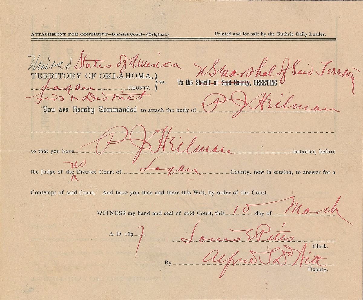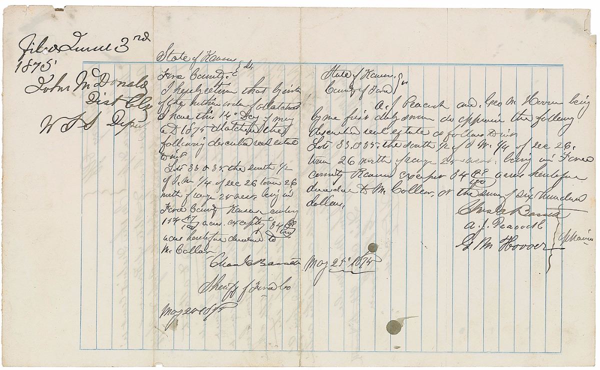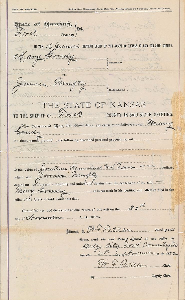 Collection of six documents from the Wild West days of Dodge City, Kansas, including: an order of attachment, June 3, 1875, signed twice by legendary Dodge City lawman and saloon owner Charlie Bassett; an attachment for contempt document issued in Logan County, Oklahoma, March 10, 1897, signed by famed gunfighter Bill Tilghman, formerly the city marshal of Dodge City; a warranty deed for a transaction by Bat Masterson (mentioning him but containing nothing in his hand), October 1, 1881; a legal document from the case of City of Dodge City vs. James Martin, February 3, 1877; an 1879 legal document regarding a case in Dodge with plaintiff Henry Page; and a writ issued in the case of Mary Goudy vs. James Mufty, Dodge City, November 20, 1882. In overall very good to fine condition. Provenance: Bonhams & Butterfields.
