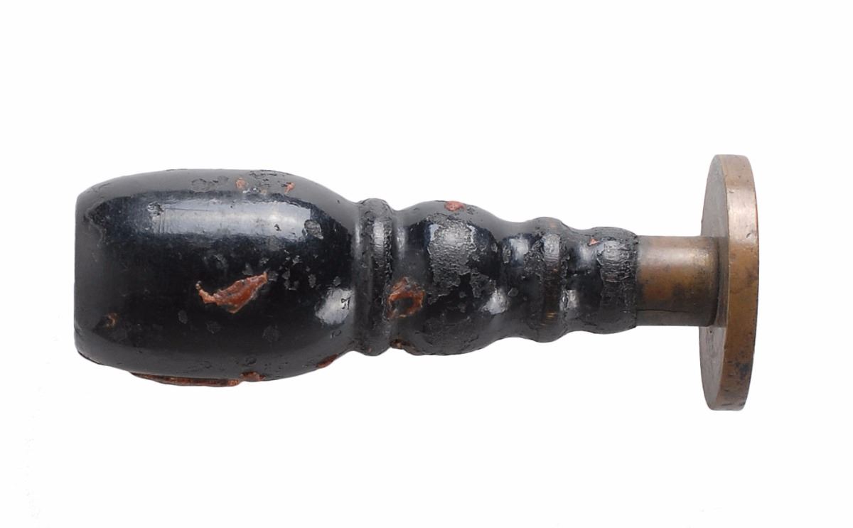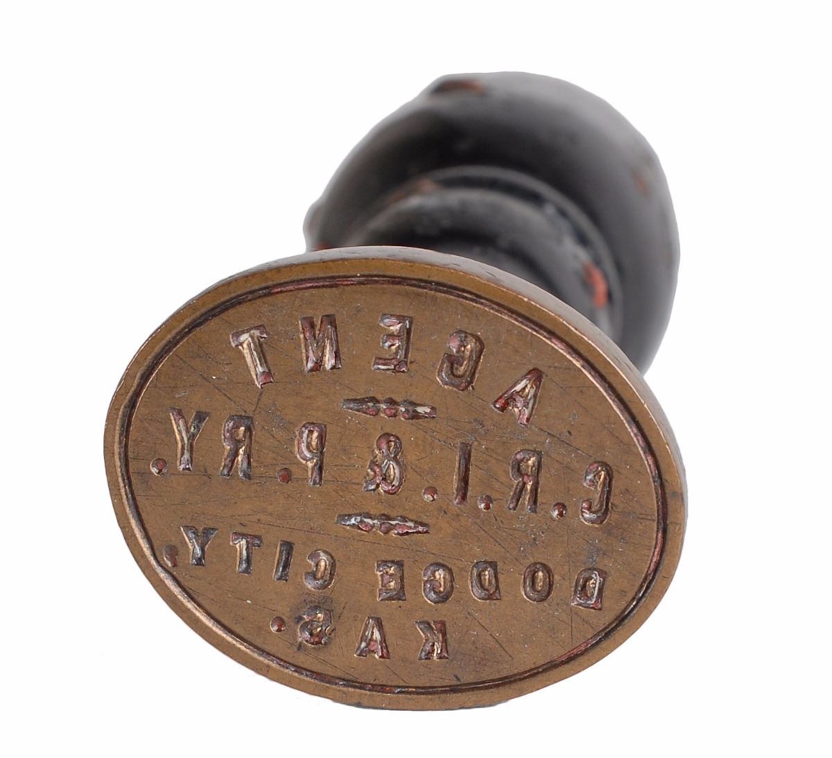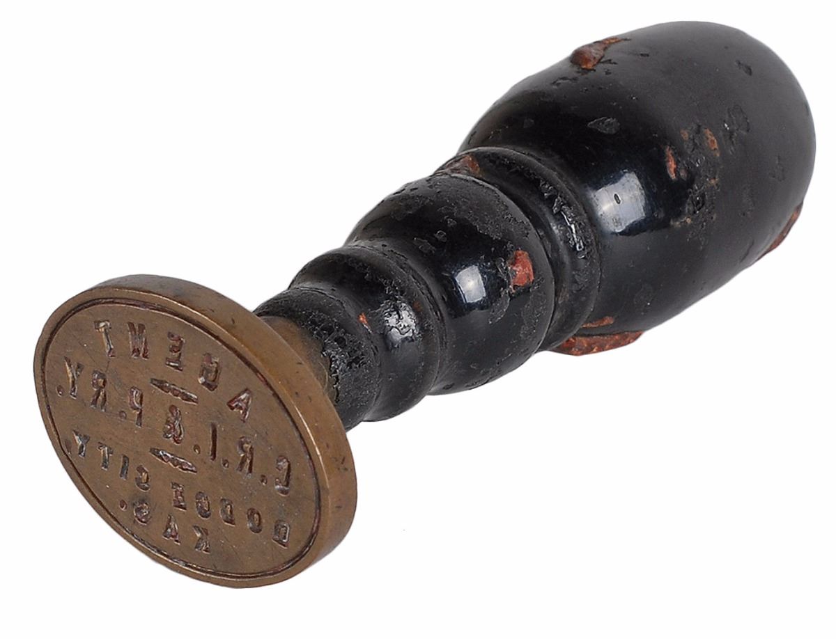 Original circa 1880s–1890s Dodge City wax sealer with an oval metal head that produces an impression reading, “Agent, C. R. I. & P. RY, Dodge City, Kas.,” which stands for the Chicago, Rock Island and Pacific Railway. The sealing stamp is attached to a dark wooden 4? long handle which is spotted with a bit of old dried wax. In fine condition. The Chicago, Rock Island and Pacific Railway leased track into Dodge City. This was one of many areas that boomed with the cattle drives up from Texas to railheads in Kansas for shipments to stockyards in Chicago and beyond. Dodge City became infamous for its diversity of saloons, gambling halls, and brothels in addition to its dense population of notorious gunslingers, gamblers, outlaws, and lawmen. A rare, museum-quality relic of the archetypal Wild West city.