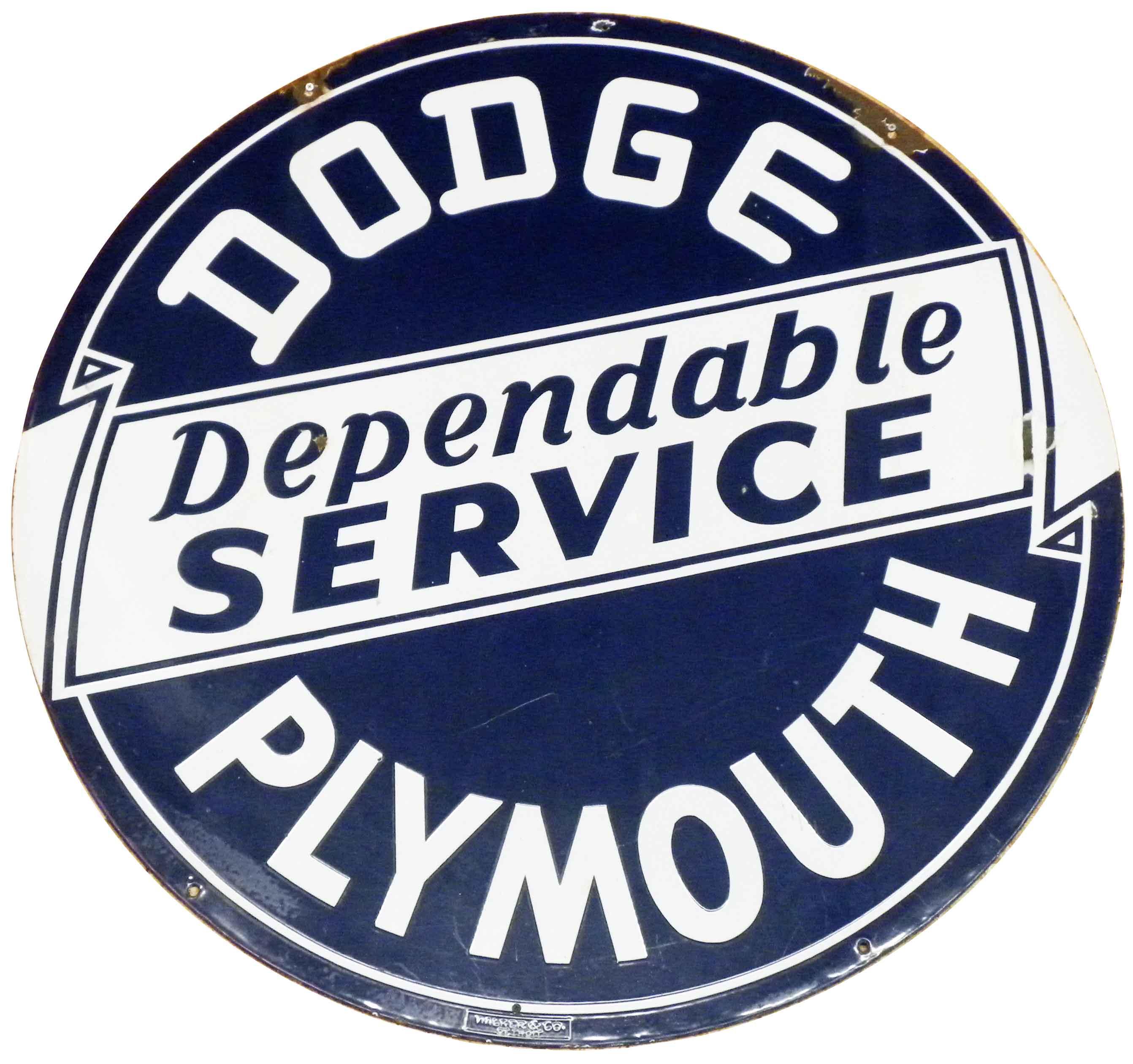 Dodge Dependable Service -Plymouth Porcelain Sign. Walker & Co. Detroit. Two sided. Chips to interior and at grommets otherwise good condition. 42 inch diameter.
